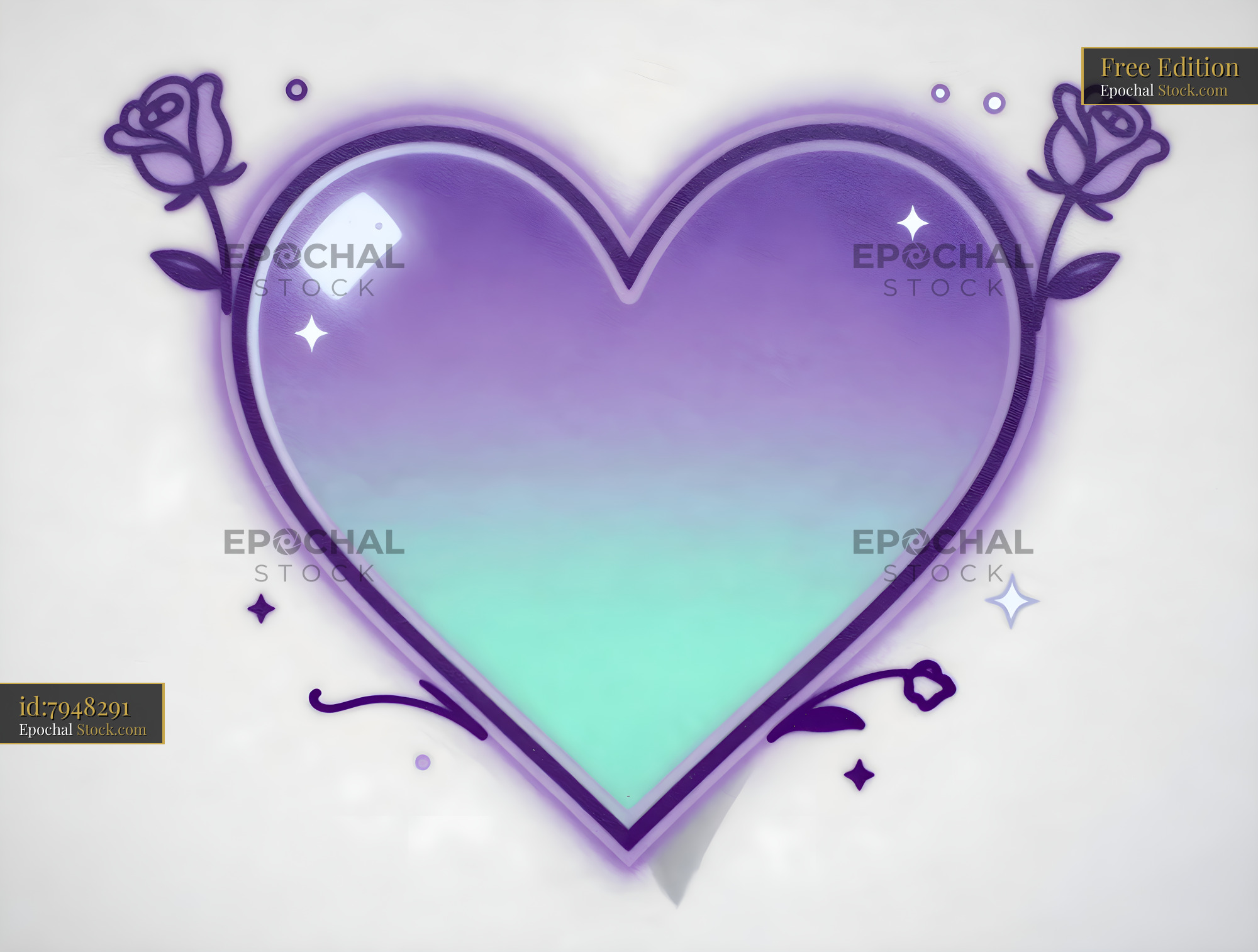 A heart shape is in shades of purple and blue. Two roses are on the sides of the heart. The background is light with sparkles around the design.