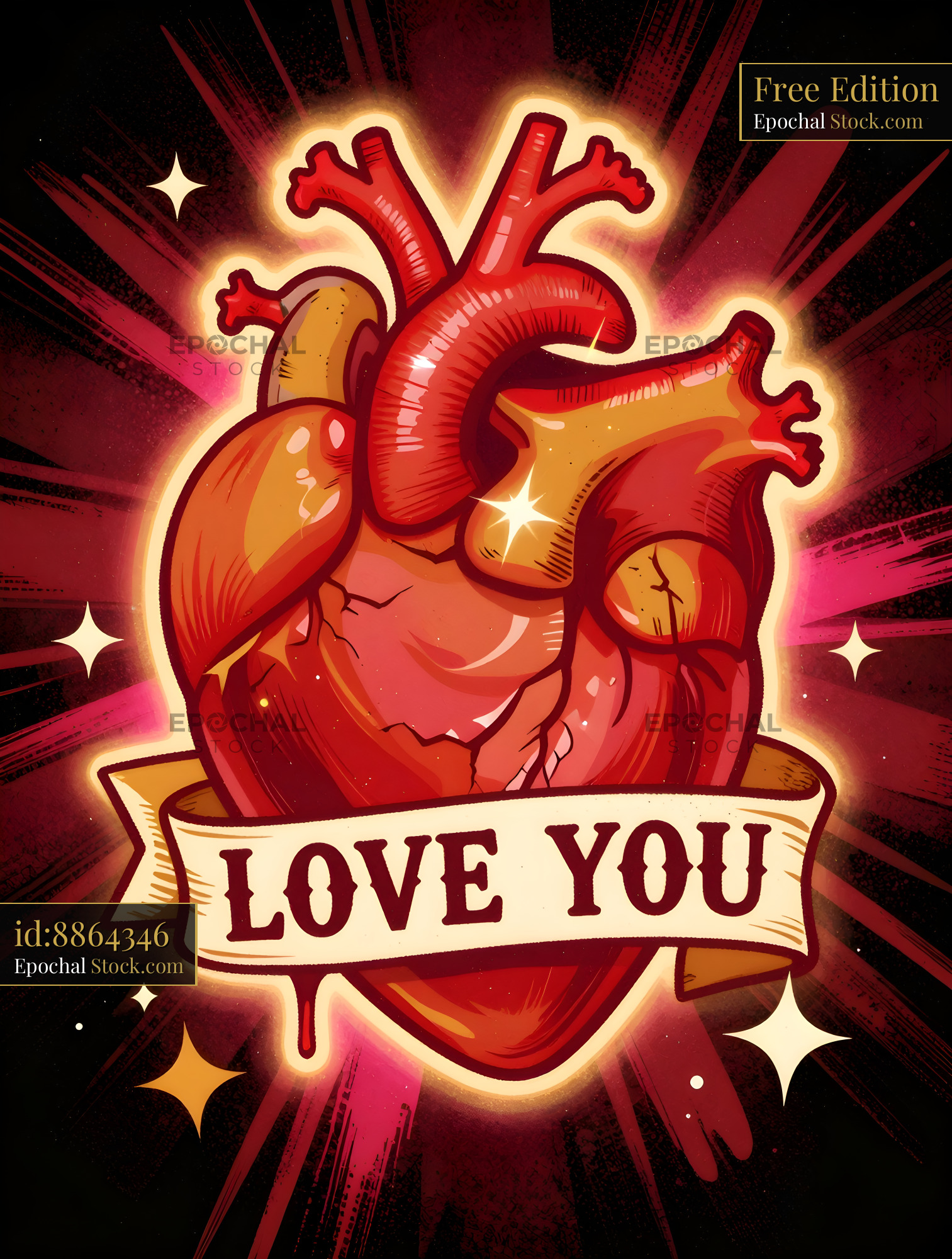 A graphic shows a heart with colorful details. The heart has a banner that says love you. Bright colors and stars create a lively effect. This is a bold statement of affection.