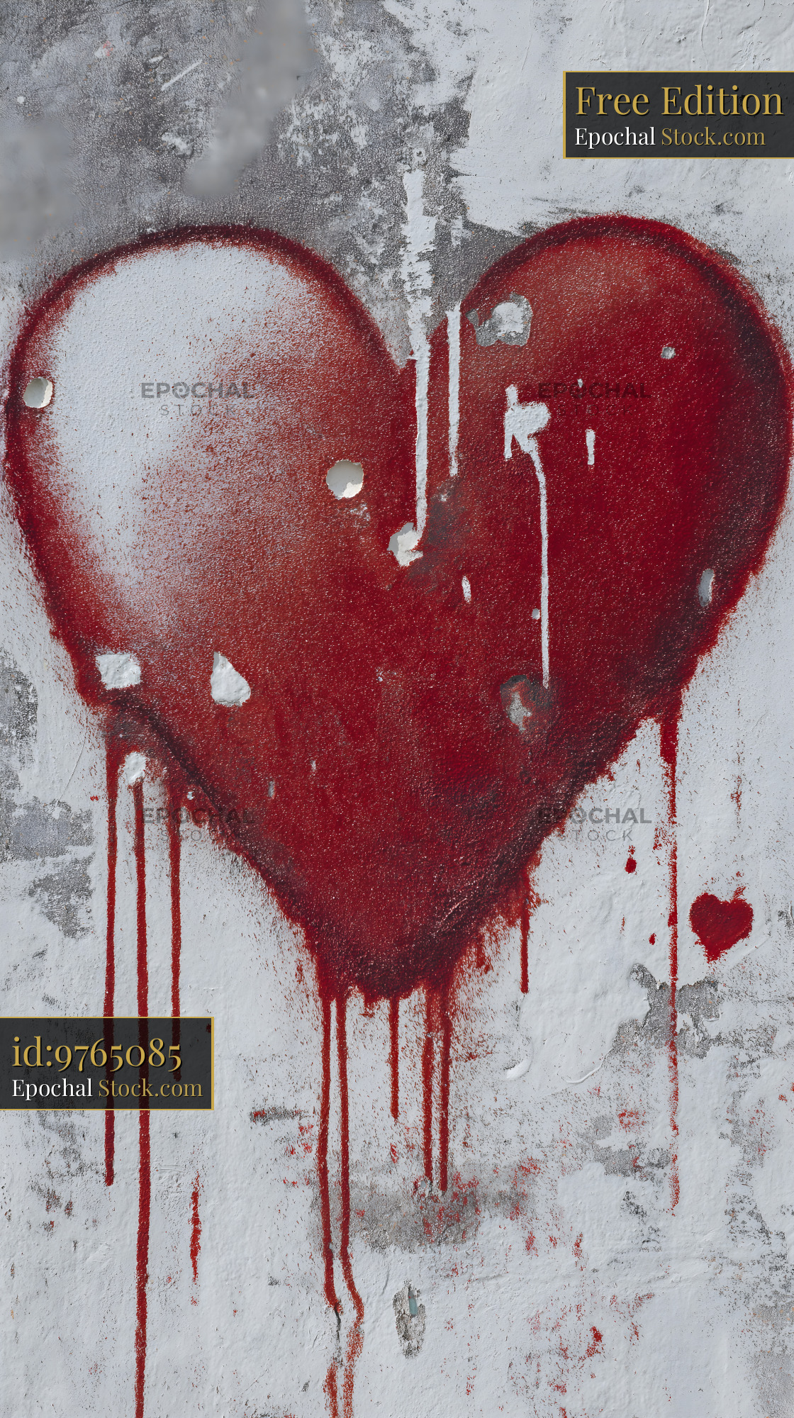A red heart is painted on a gray concrete wall. The paint drips down, creating a bold and striking design. This artwork is located in an urban area, showcasing street art culture.
