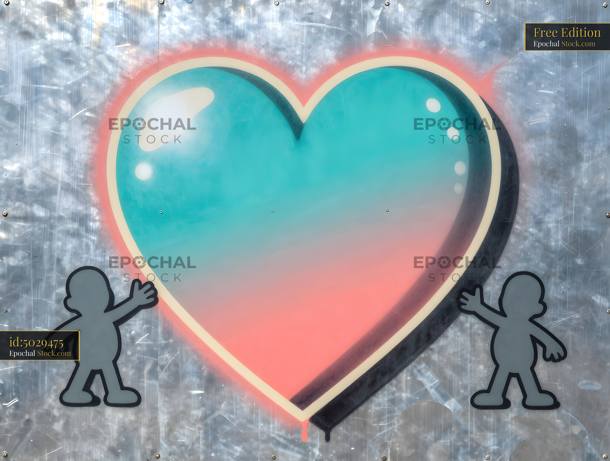 A large heart graphic is painted on a metal surface. Two simple figures stand beside the heart. The setting is urban and the time is during the day. The scene shows street art.