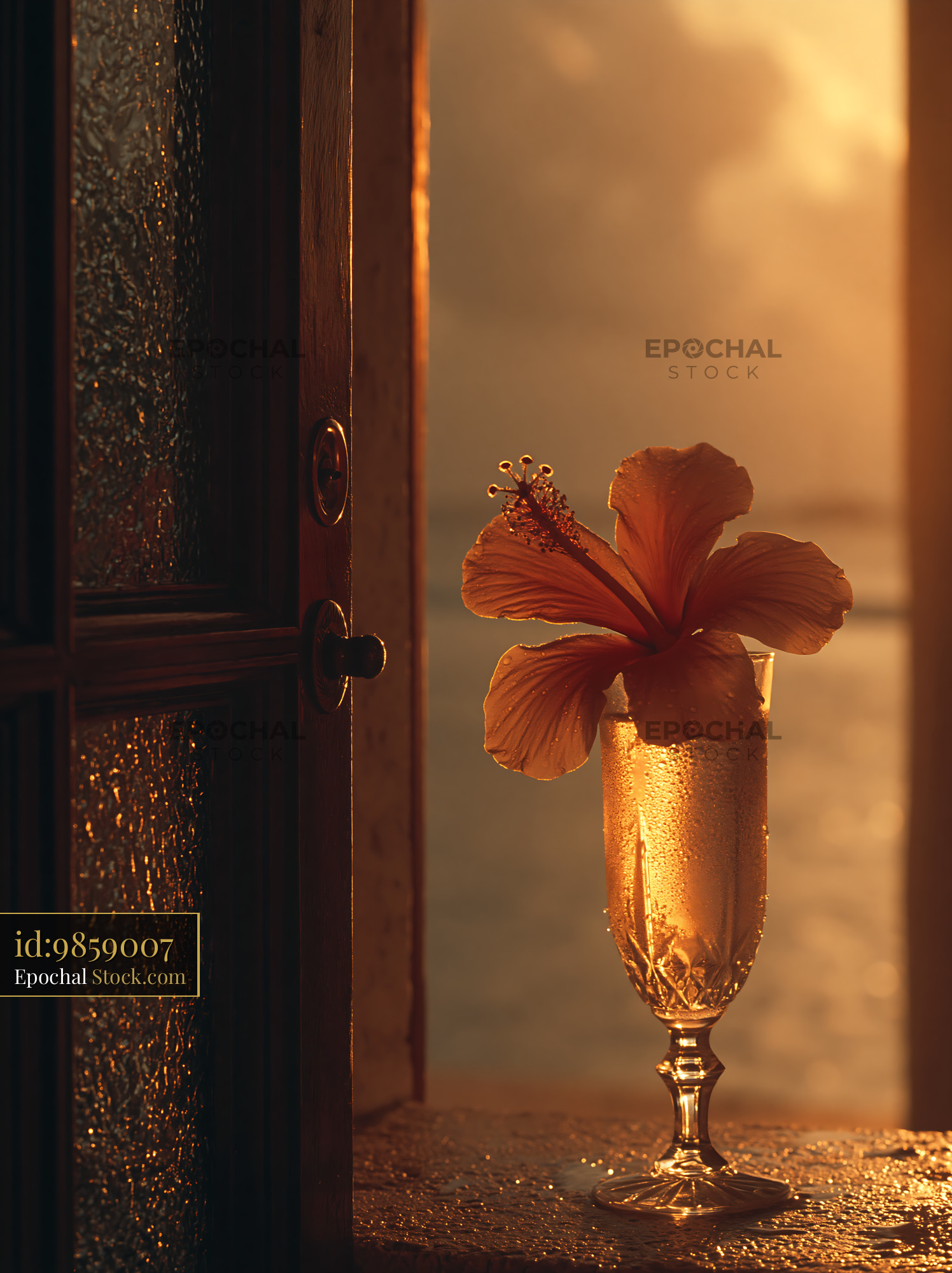Hibiscus flower on glass of champagne at sunset by the ocean