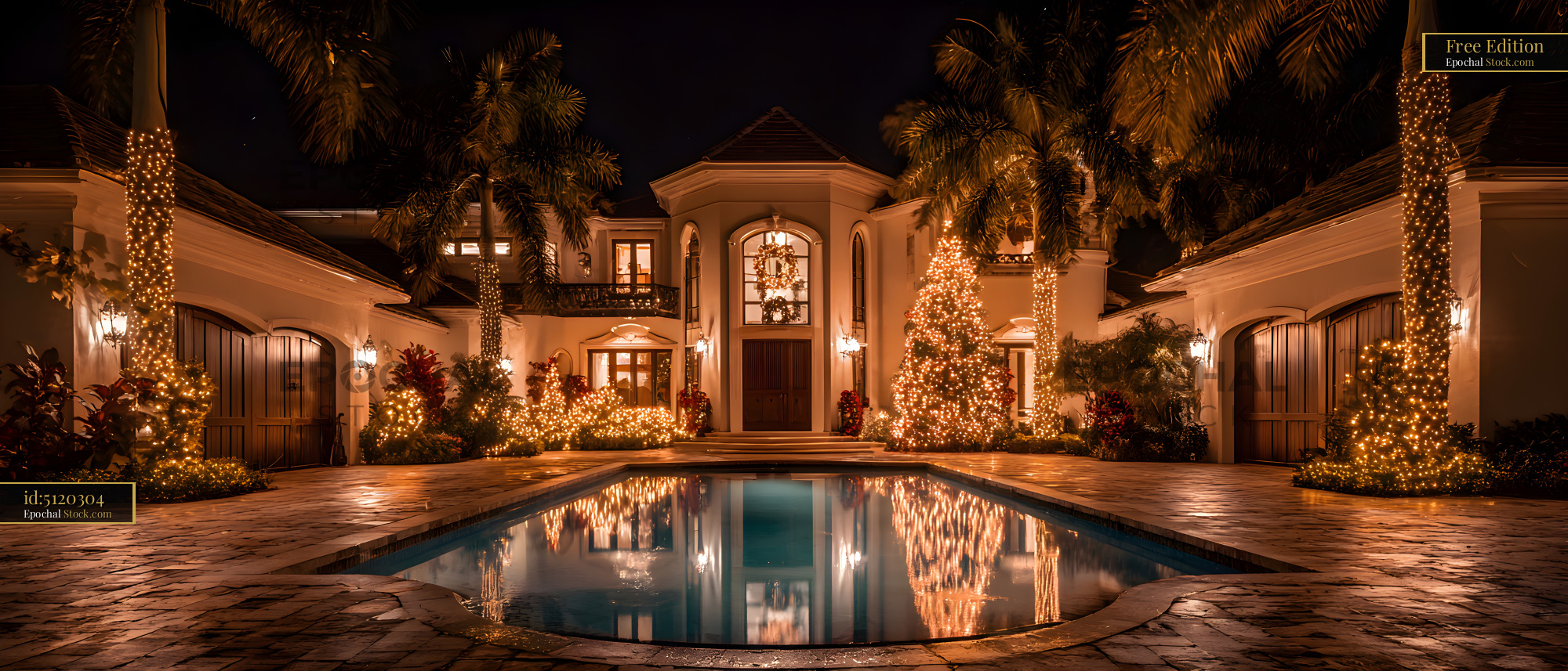 A house is decorated with lights during the holiday season. The pool reflects the lights. Palm trees surround the home. It is night and the atmosphere feels festive.