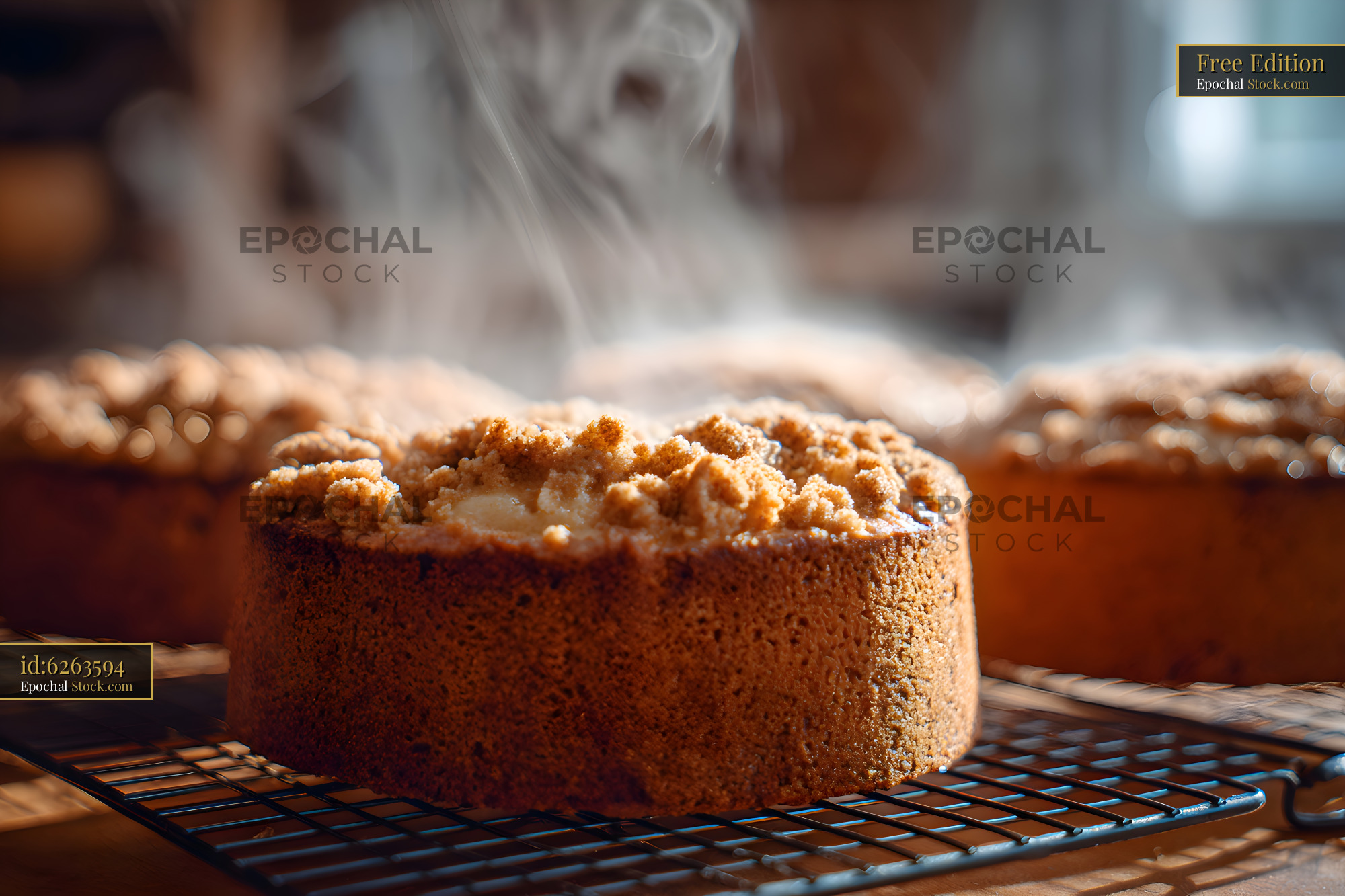 Cakes are placed on a wire rack in a kitchen. Steam rises from the cakes as they cool down after being baked. Crumbs sit on top of the warm cakes.