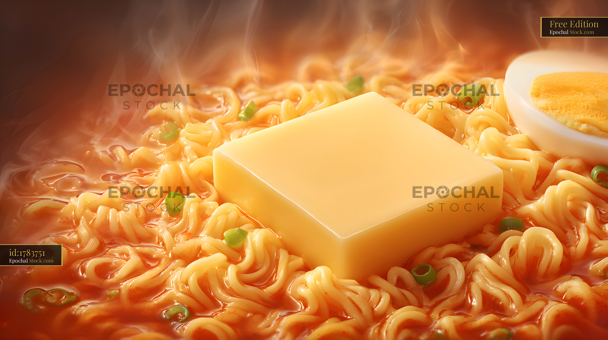 Noodles are swimming in hot broth with a block of cheese melting on top. A half egg is placed beside the noodles. Green onions add color to the dish. Steam rises from the bowl.