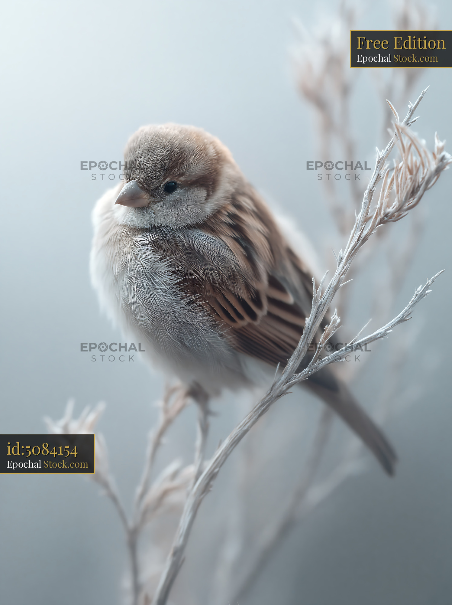 A small sparrow sits huddled on a bare branch, feathers fluffed against the cold, evoking themes of winter survival, quiet resilience, and the fragility of nature.