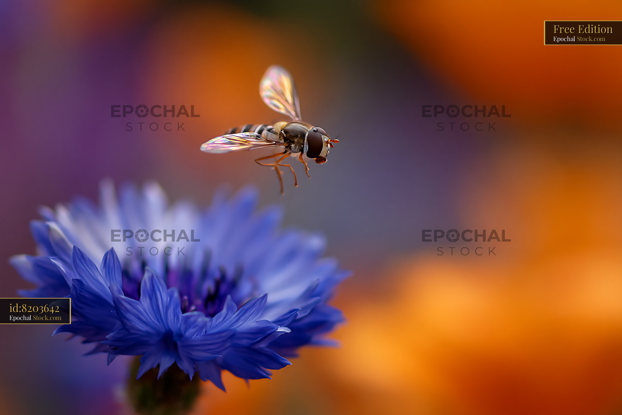 A detailed macro shot of a hoverfly hovering above a vibrant blue cornflower, capturing the delicate moment of pollination against a soft orange and purple bokeh background.