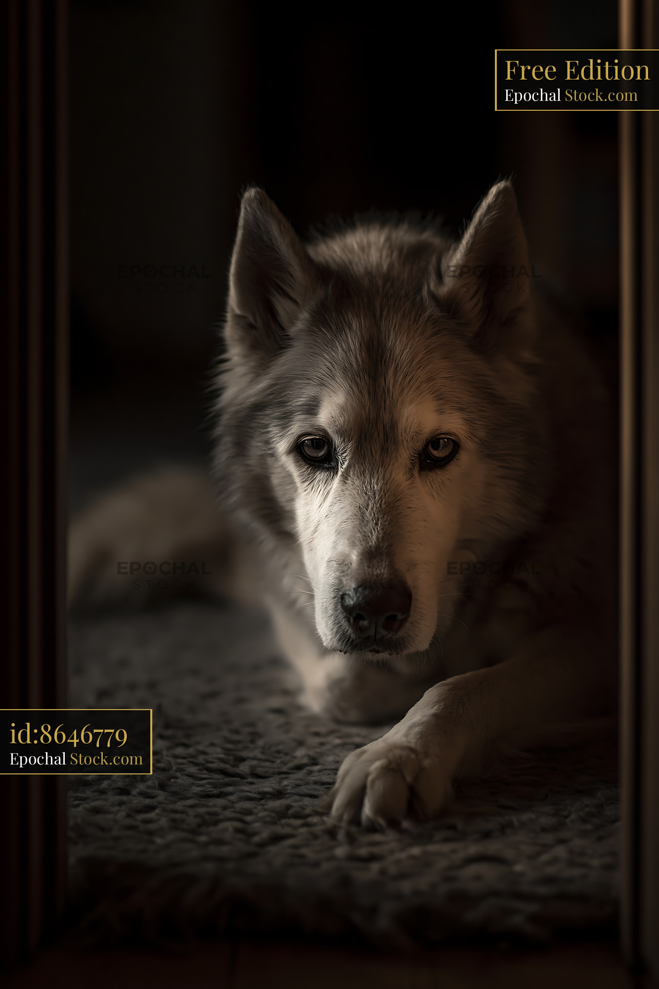 A soulful Siberian husky rests on a soft carpet, framed by a doorway in a dark room, capturing a moment of quiet loyalty and watchful presence in moody lighting.