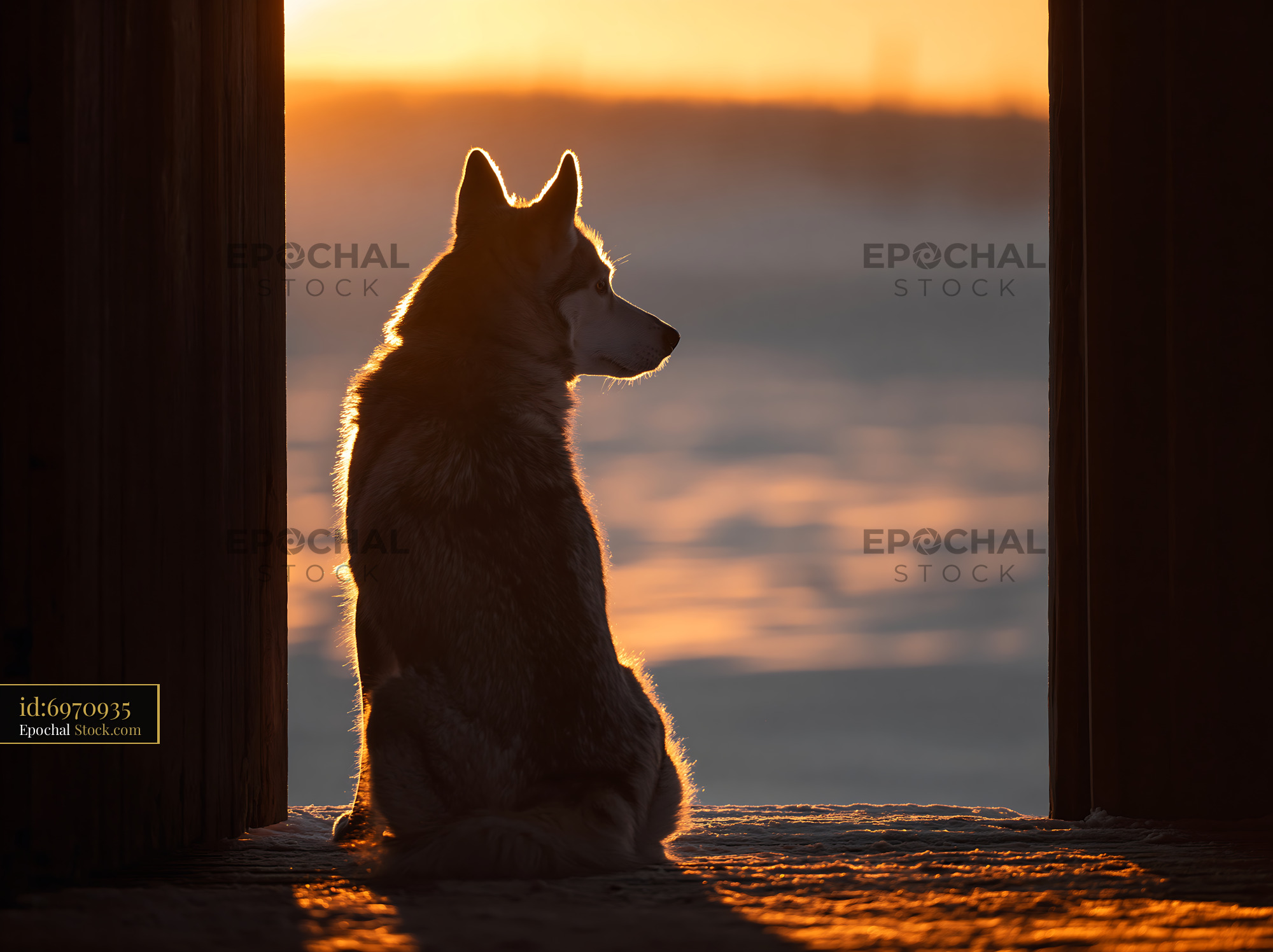 A Siberian husky sits silhouetted in a doorway, gazing at a vibrant orange sunset over a snowy landscape, evoking a sense of peaceful solitude, loyalty, and quiet anticipation.