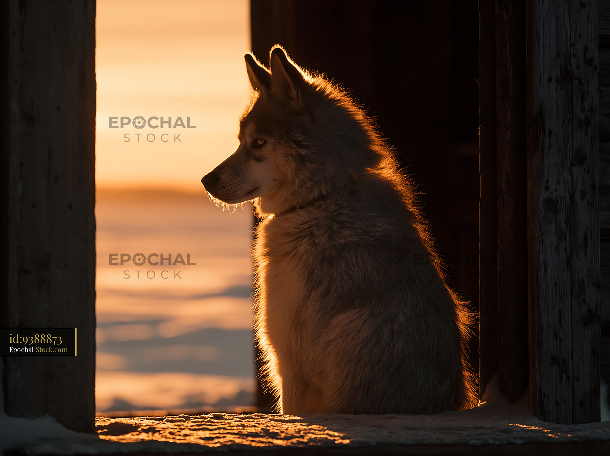 A majestic husky sits in a wooden doorway, its fur illuminated by warm rim light against a snowy winter landscape, capturing a sense of peaceful solitude and loyalty.