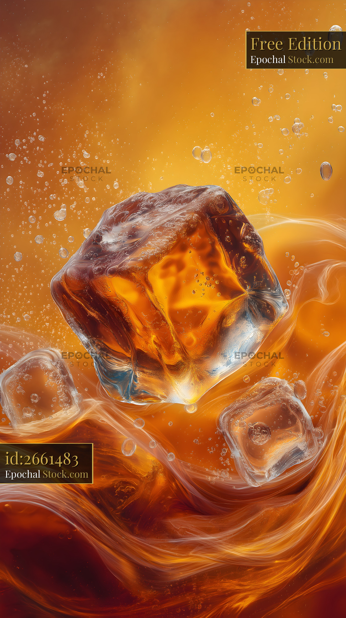 An ice cube floats in a drink filled with bubbles, surrounded by warm orange liquid. The scene shows the motion of the drink and the clarity of the ice, creating a lively effect.
