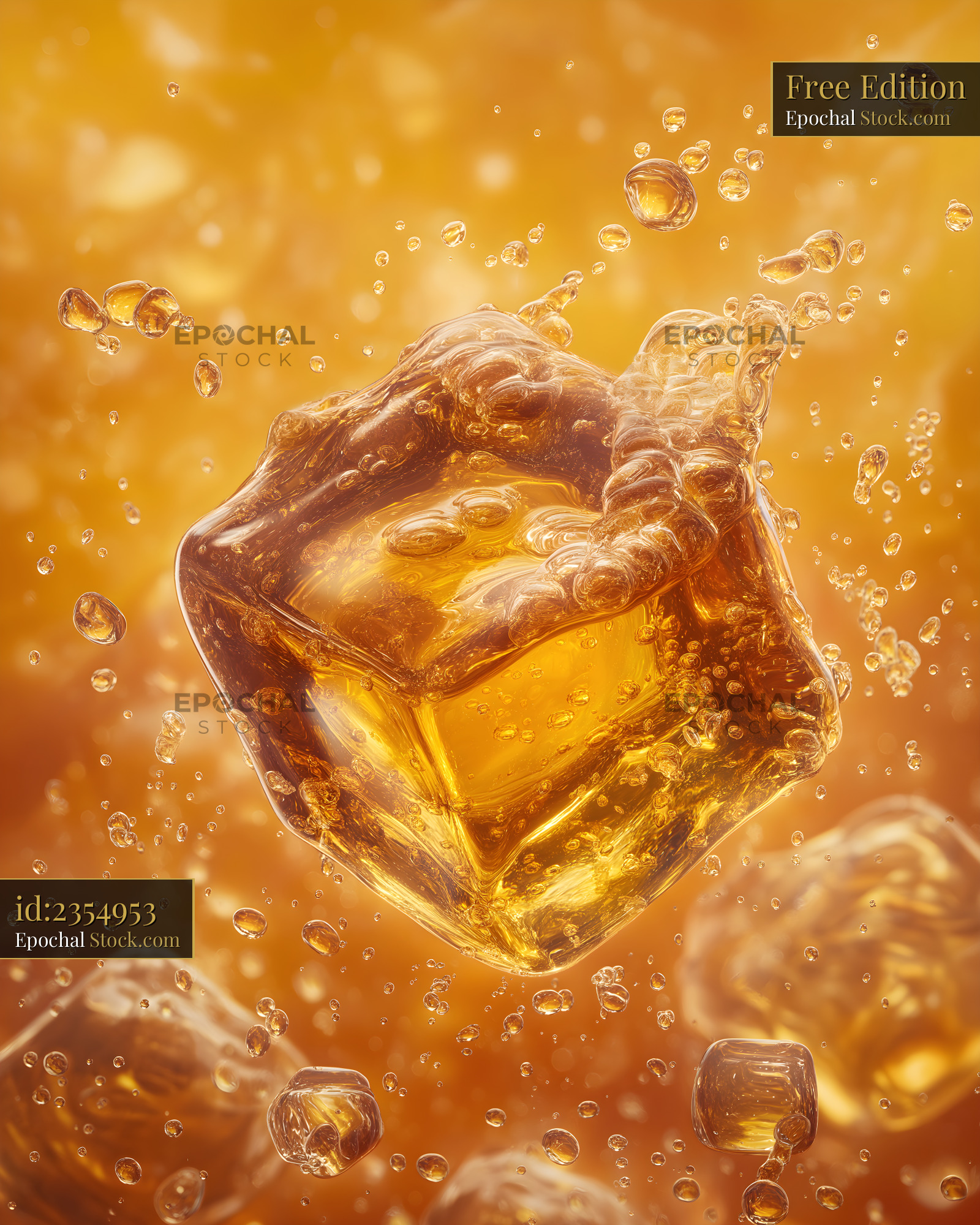 An ice cube is floating in a golden liquid. Bubbles surround the ice cube and rise to the surface. The setting shows a sense of refreshing drink.