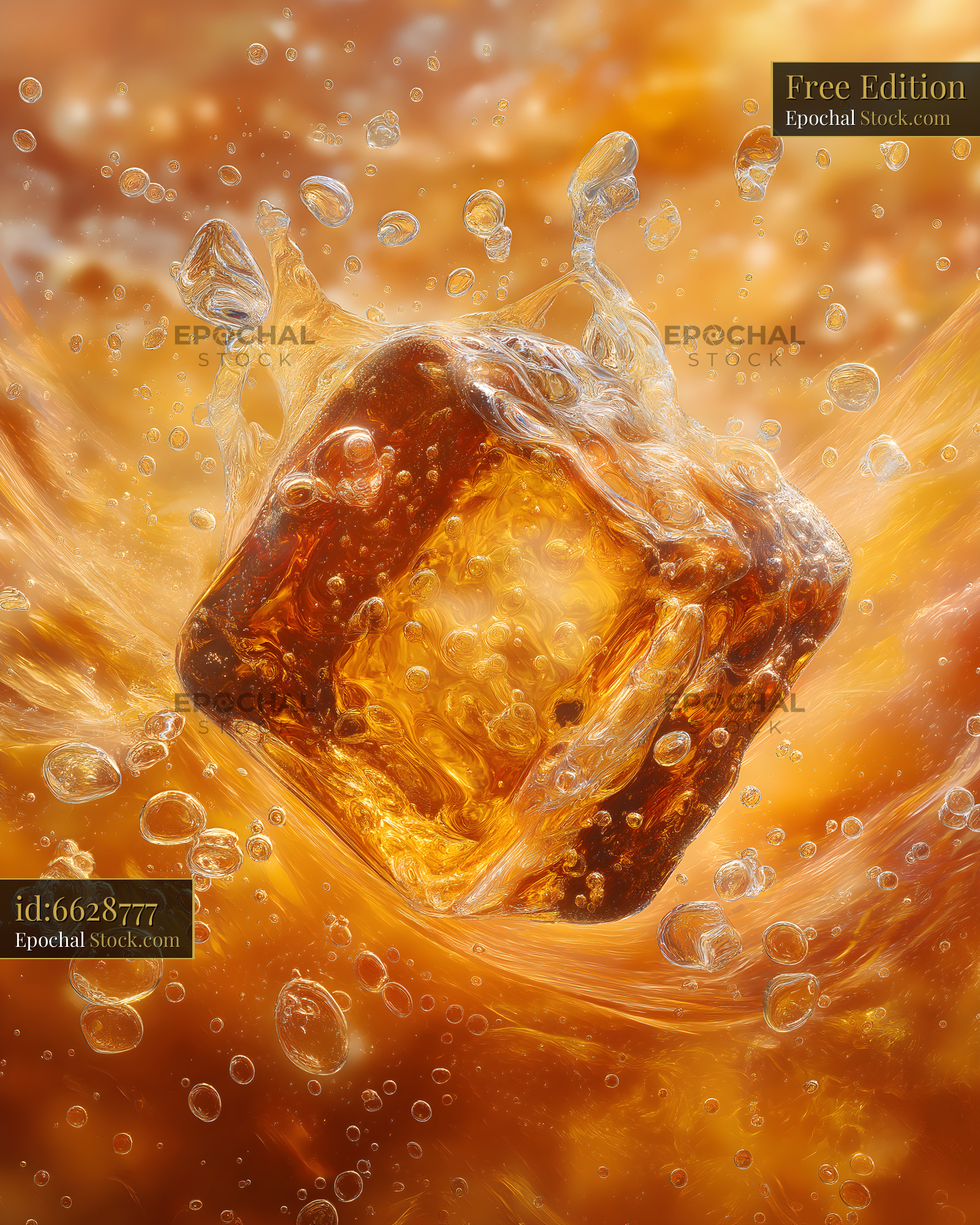 An ice cube is dropped into a brown liquid, causing splashes and bubbles to rise. The scene captures the moment with water droplets scattered around in a dynamic manner.