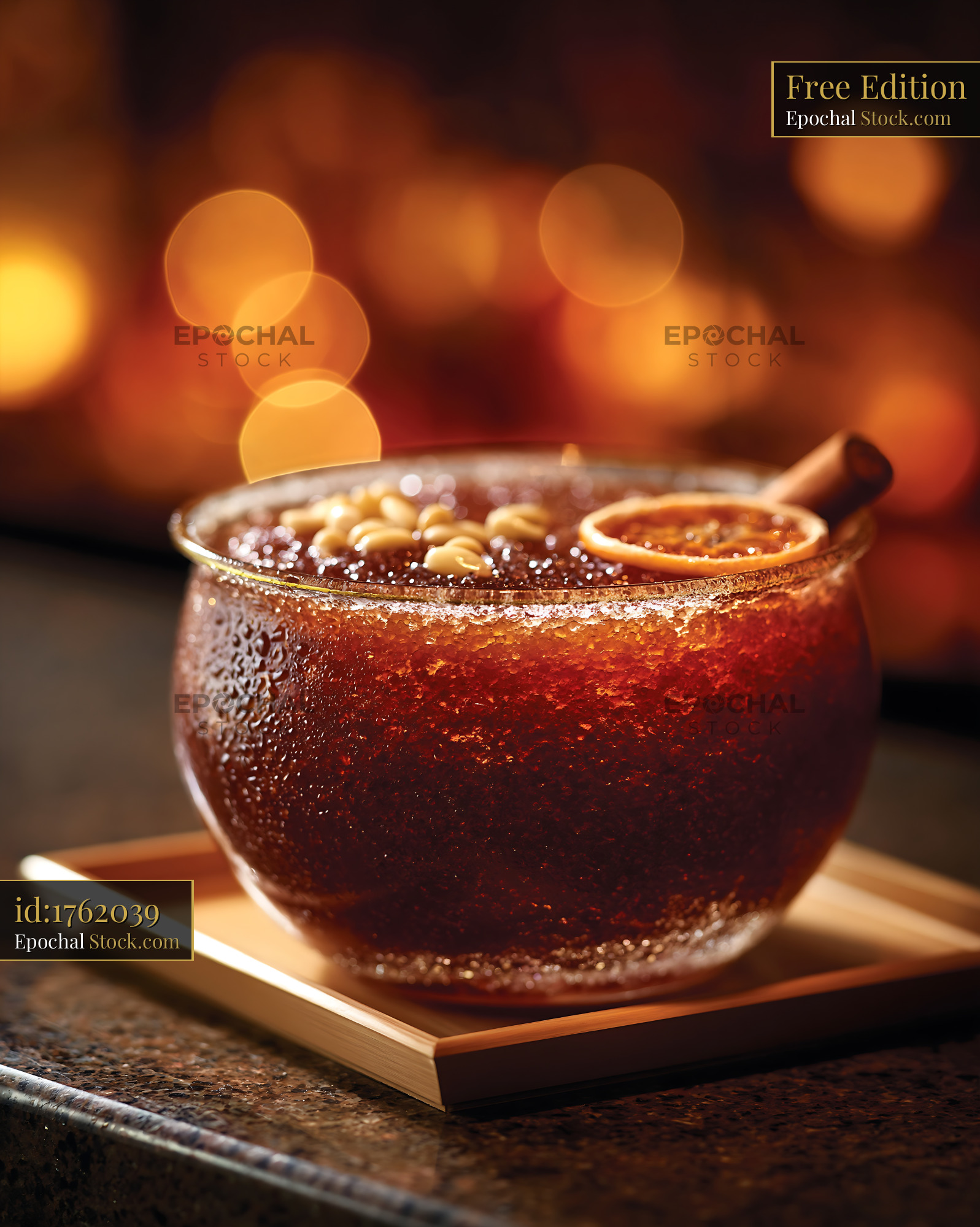 A chilled sujeonggwa smoothie garnished with pine nuts and cinnamon, offering a modern twist on the traditional Korean punch amidst warm festive bokeh lights.
