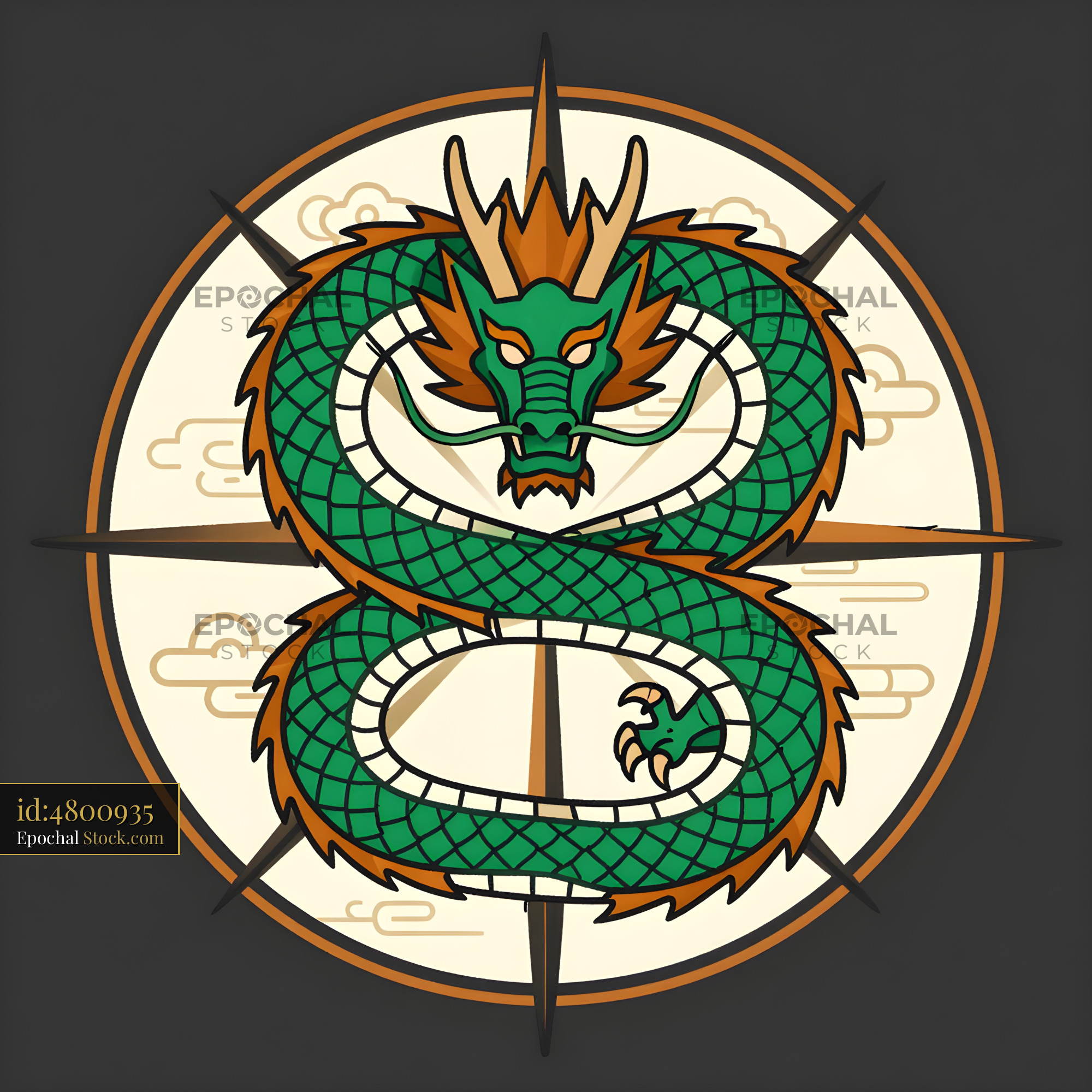 A green dragon winds around itself in a circular design. The dragon has a fierce look and sharp claws. This artwork includes light clouds in the background and a compass motif.