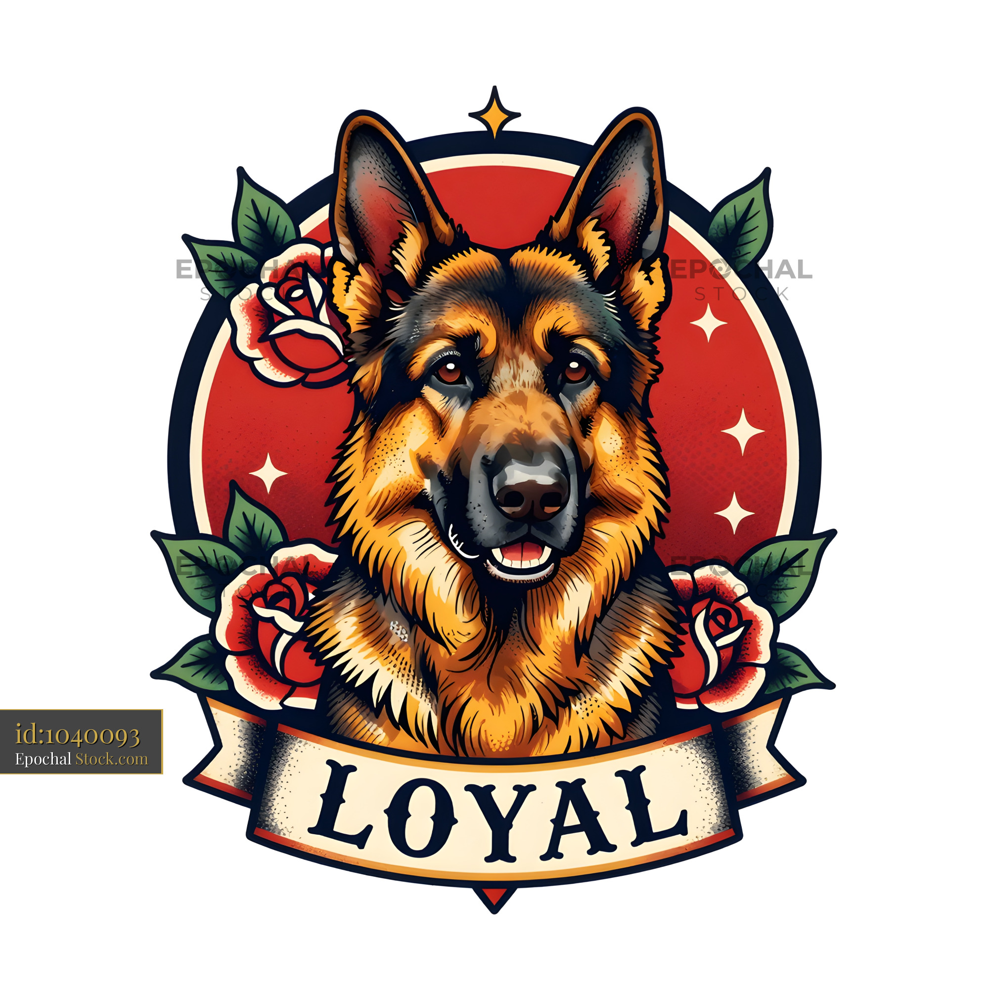 A German Shepherd is shown in front of a red background. There are roses placed around the dog. The word loyal is written below the dog. This image shows dog loyalty and beauty.