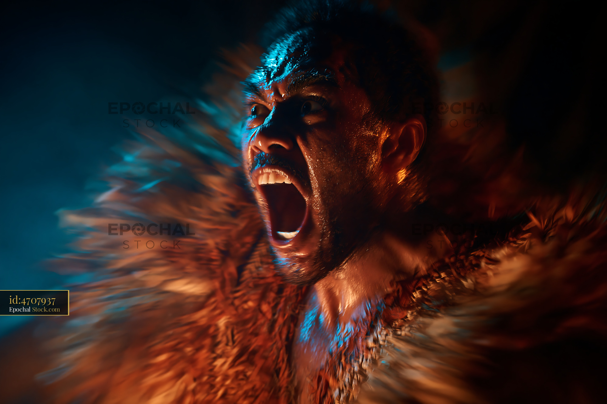 A powerful indigenous man lets out a fierce war cry, his face illuminated by dramatic orange and teal lighting, evoking themes of strength, heritage, and raw emotion.