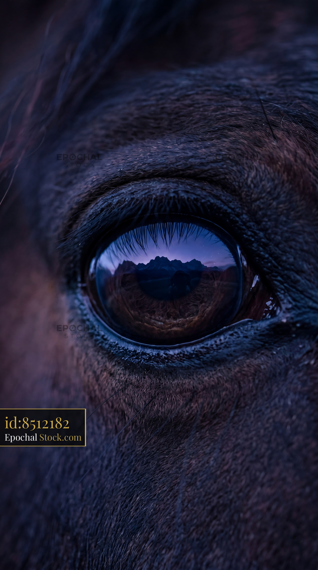 A stunning macro horse eye reflecting a dawn mountain range. Perfect for unique equestrian home decor, statement wallpaper, or custom apparel in deep indigo and violet tones.
