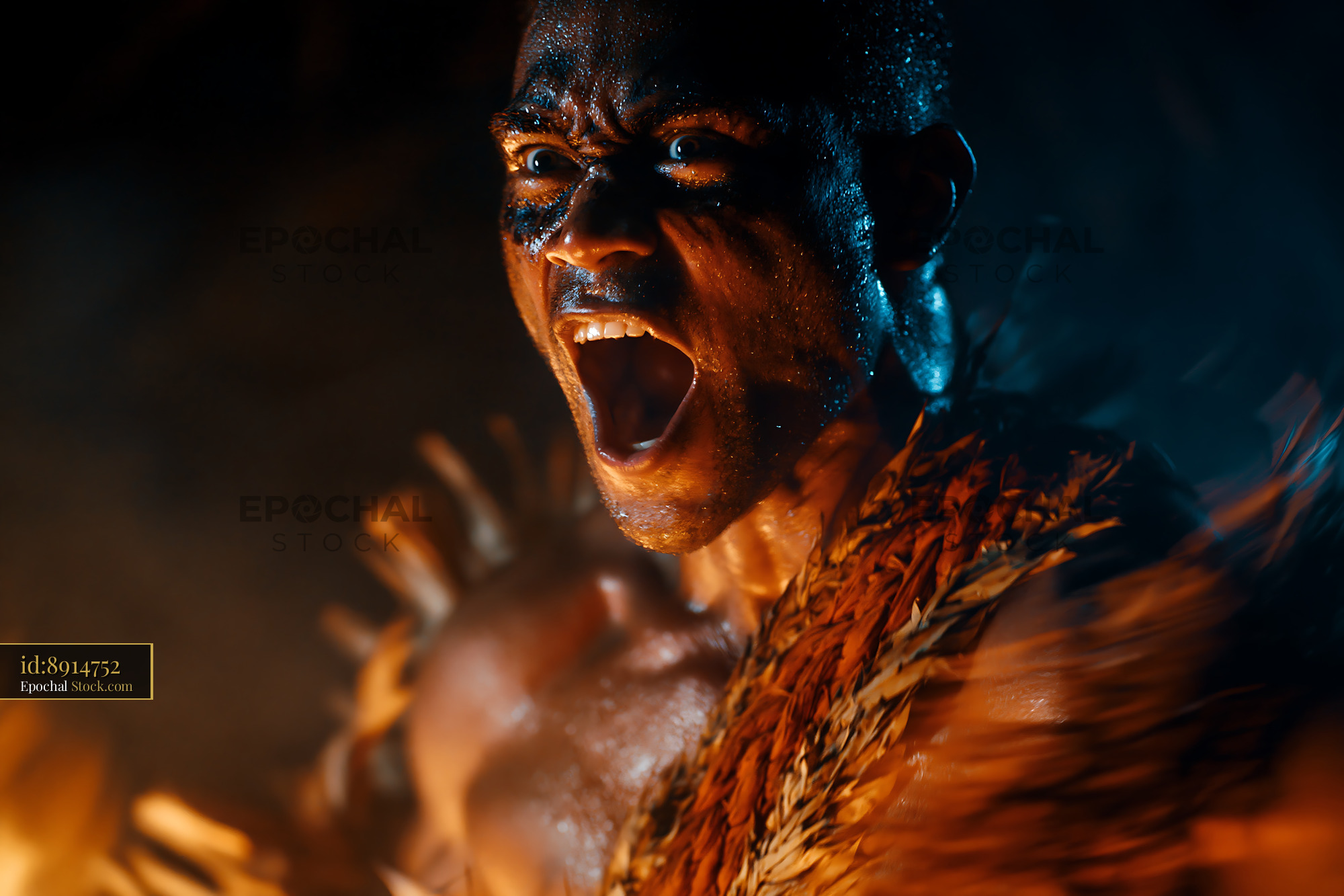 A powerful portrait of a Black man with face paint shouting intensely, illuminated by firelight and cool night tones, evoking themes of strength, ancestral heritage, and primal emotion.