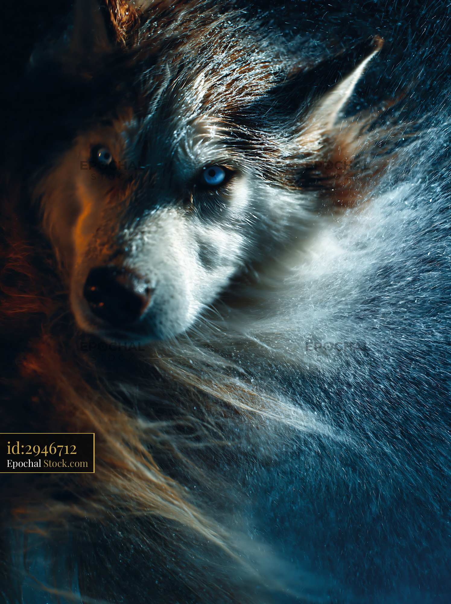Intense portrait of a wolf with piercing blue eyes in a snowstorm