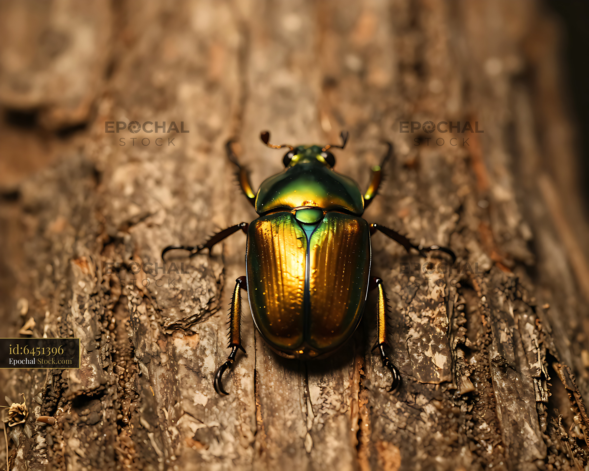 A close-up view of a metallic, jewel-toned beetle resting on weathered wood, highlighting the intricate textures of nature and the vibrant, shimmering colors of the insect.
