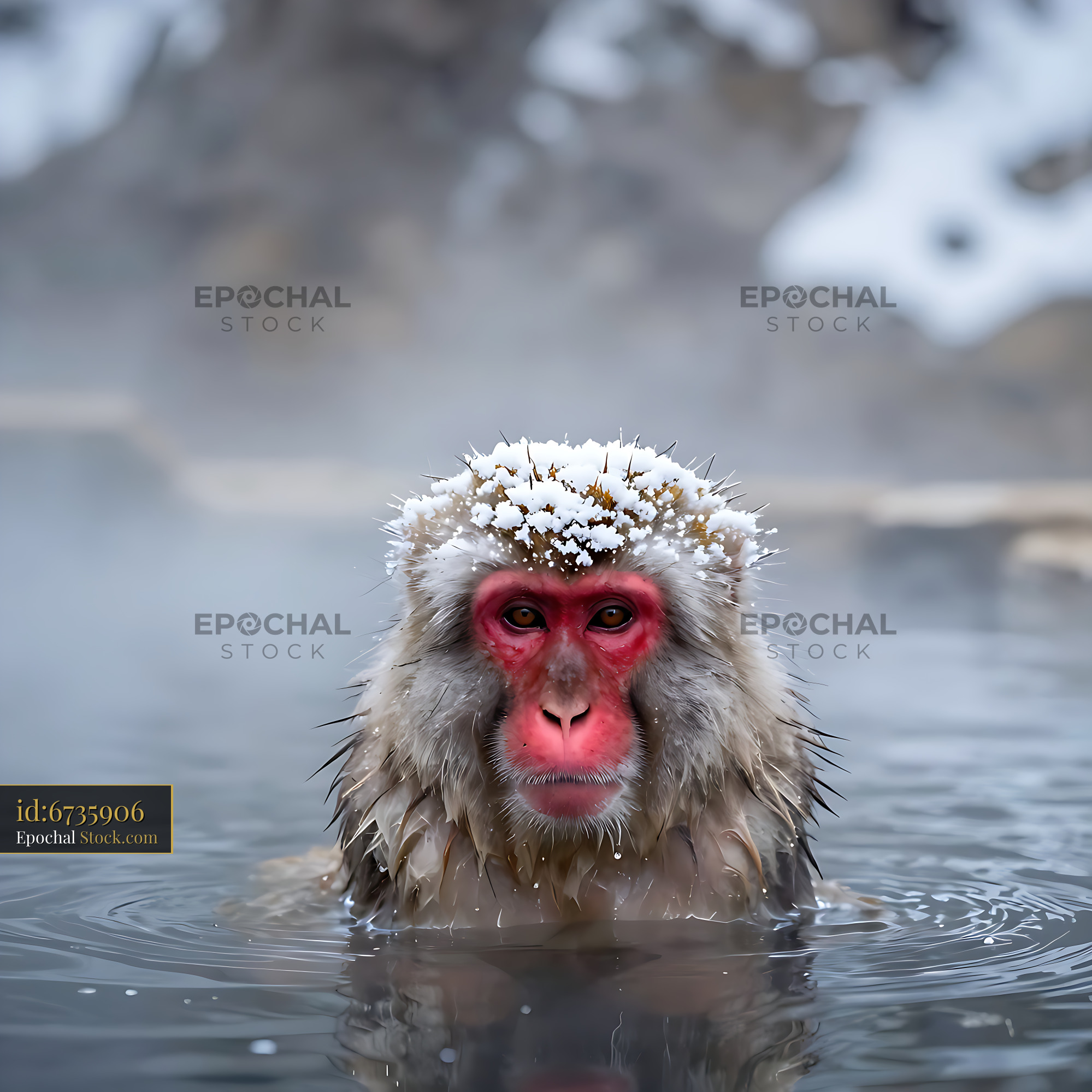 Japanese macaque with snow on its head bathing in a hot spring