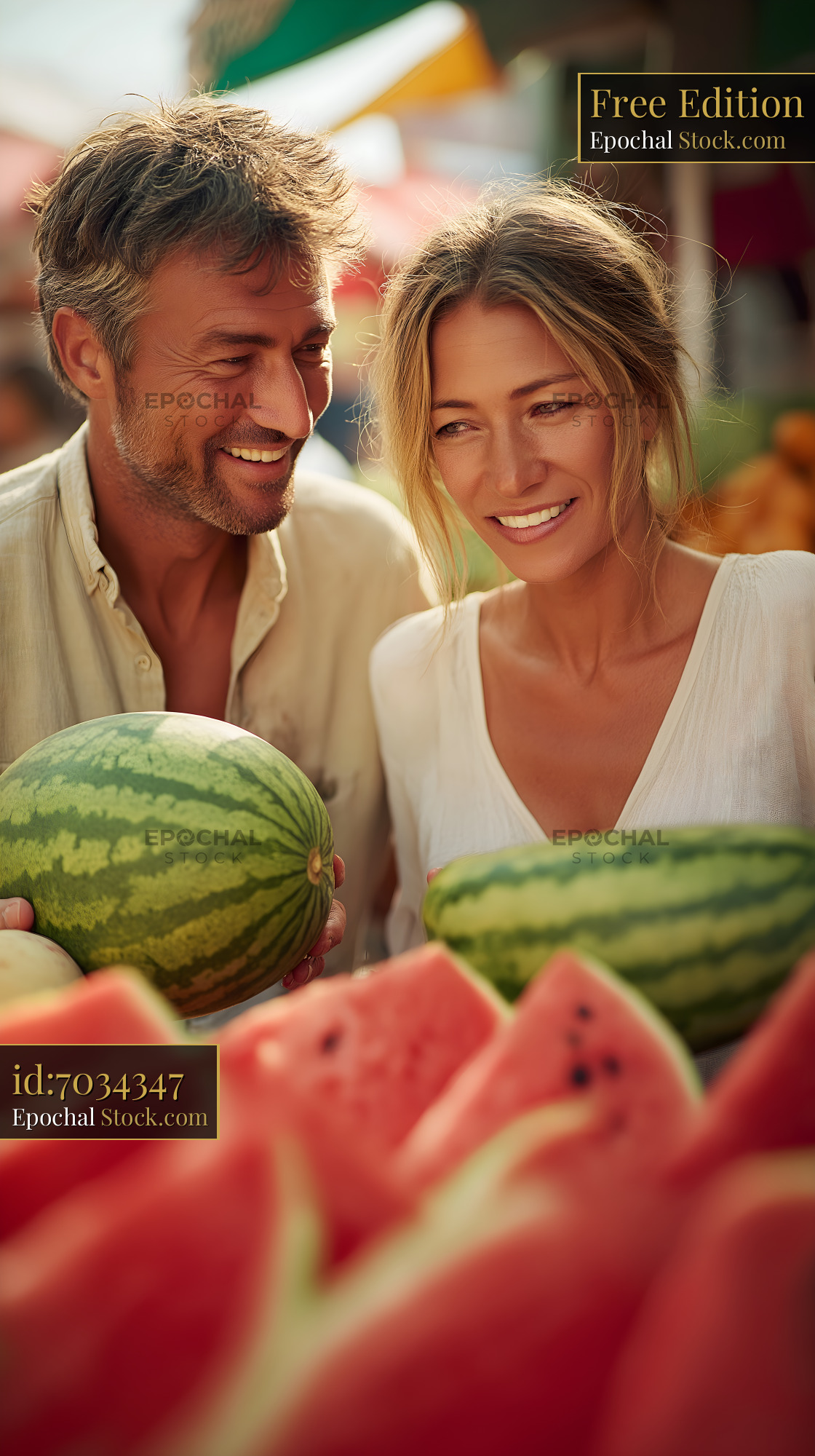 Joyful couple enjoys shopping for watermelons at market Free Premium Stock Image