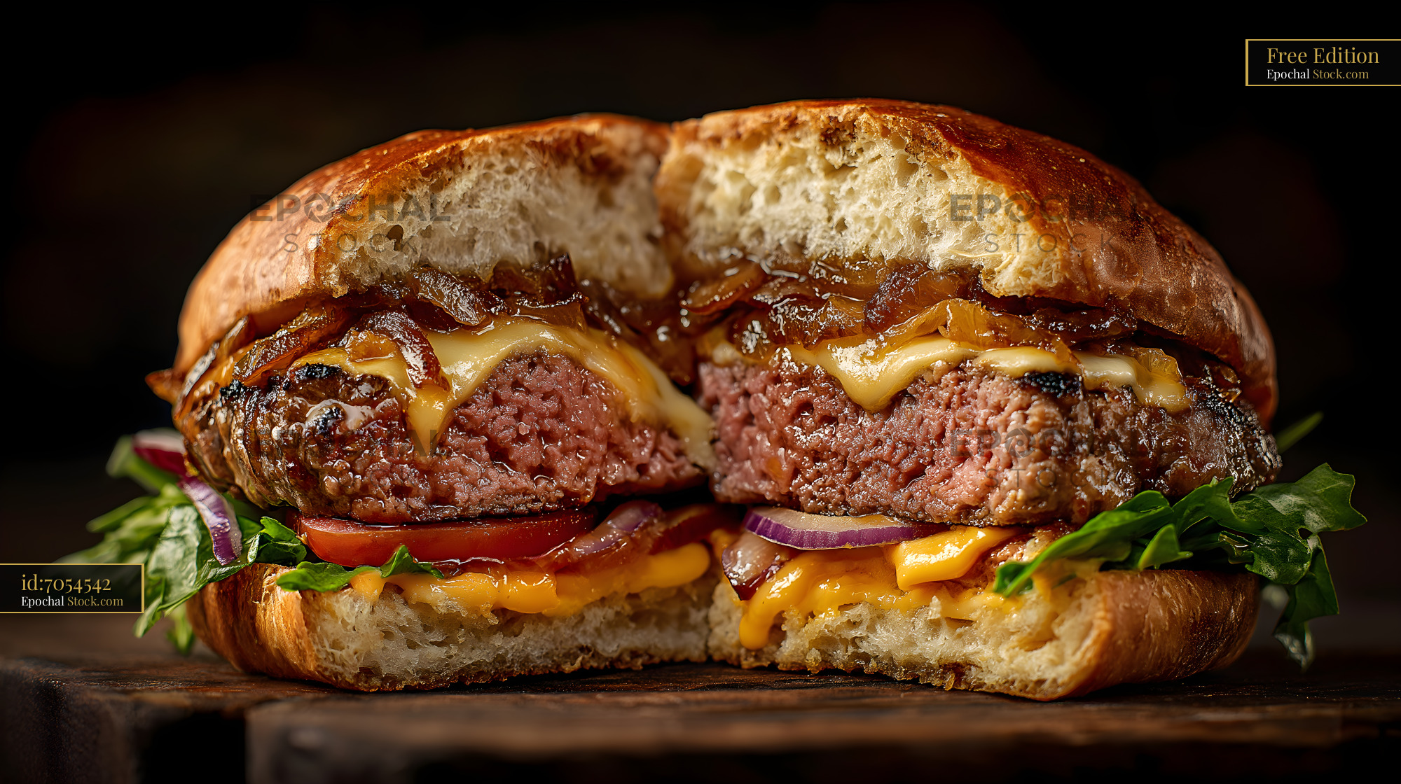 Juicy burger cut in half with toppings on a wooden surface Free Premium Stock Photo