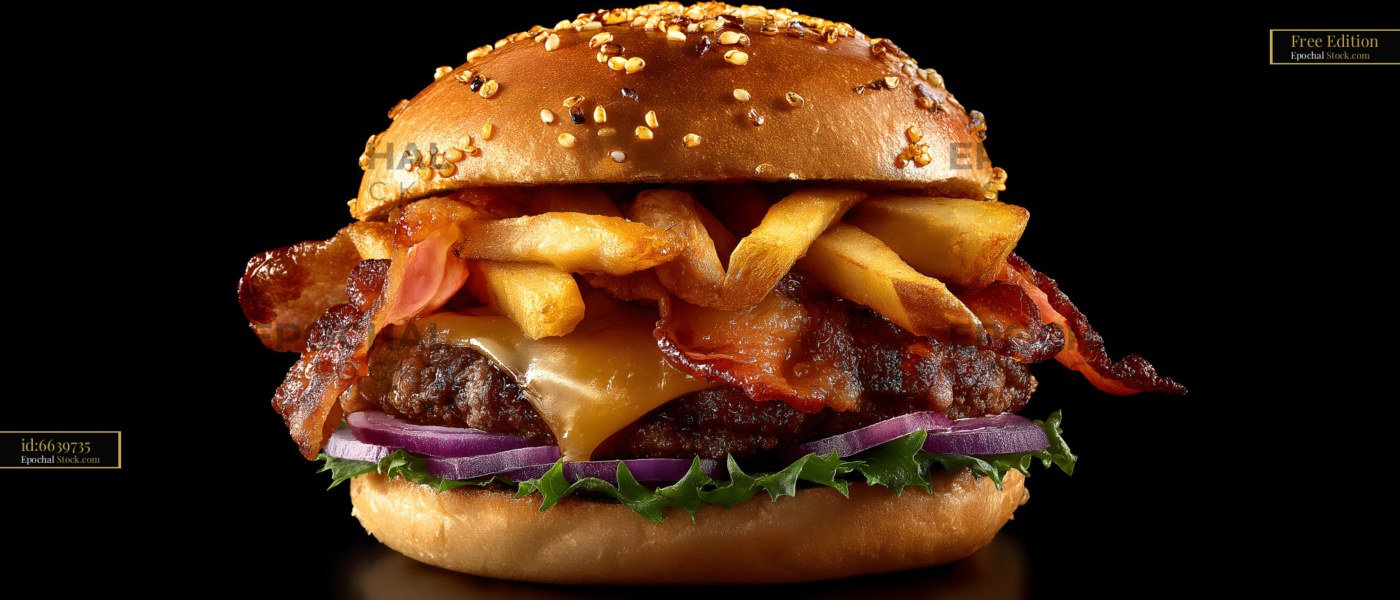 Juicy burger with bacon and fries stacked high on bun Free Premium Stock Photo