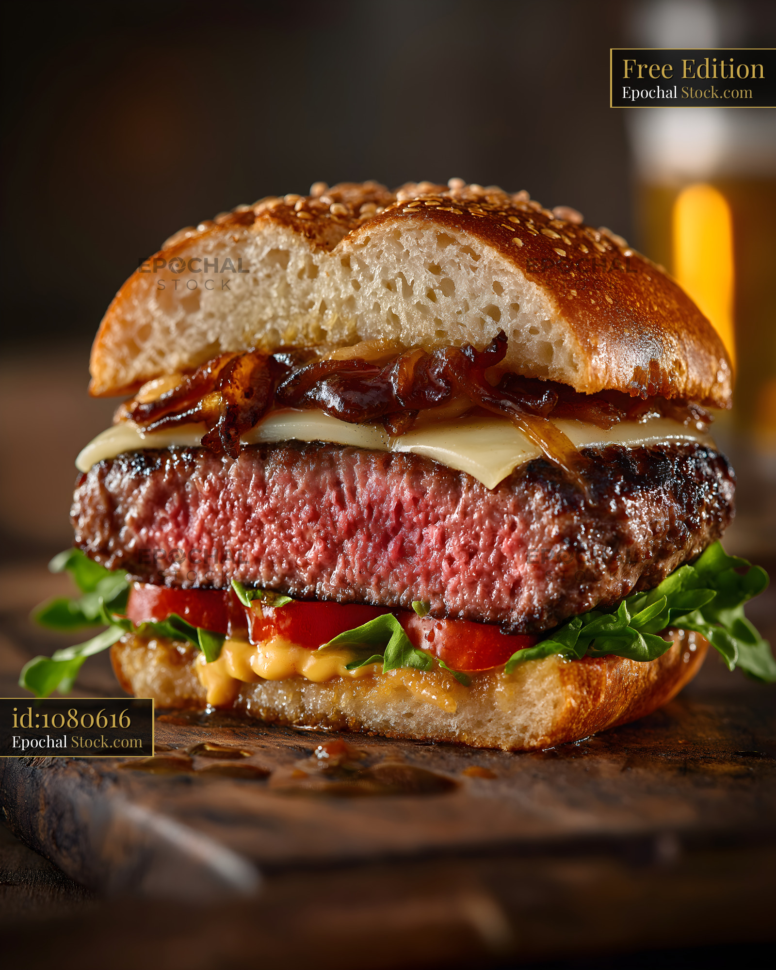 A burger sits on a wooden board. The bun is toasted and has sesame seeds on top. Inside, there is a thick beef patty, melted cheese, lettuce, tomato, and onions.