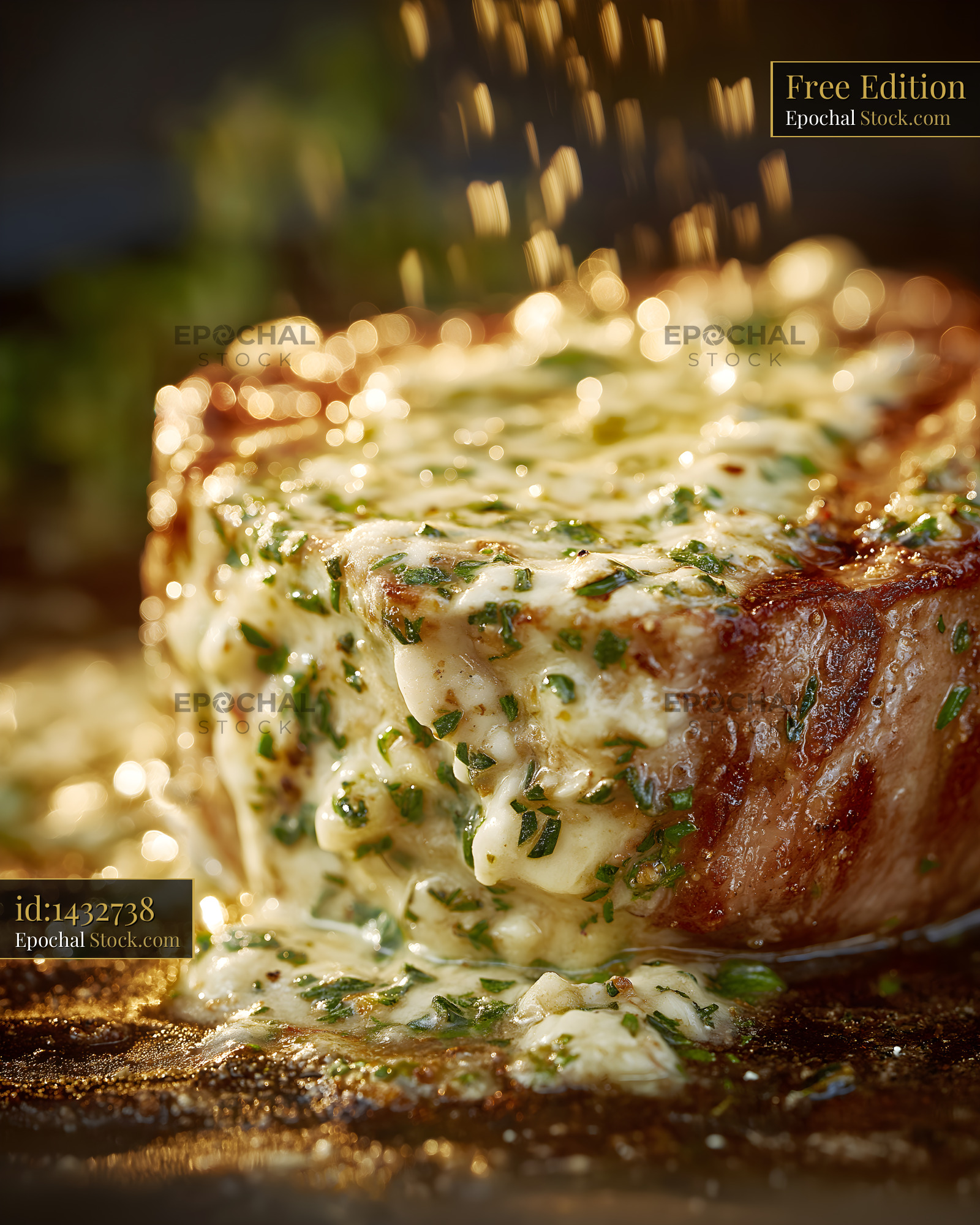 A steak cooks on a grill as herbs and sauce melt over it. Light reflects off the dish. The scene captures the hot cooking and delicious flavors coming together.