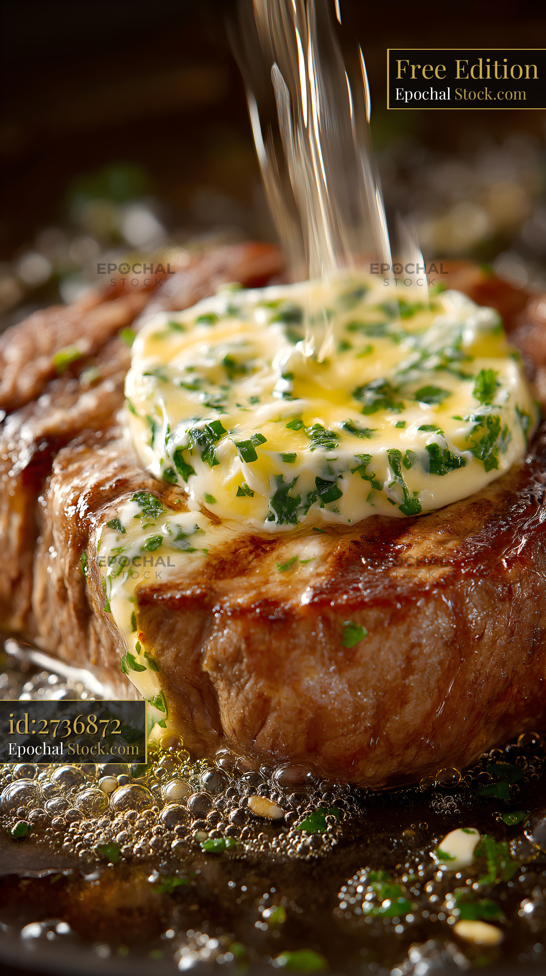 A thick piece of steak is on a hot skillet. Butter with herbs drips down the side. The cooking process shows sizzling and bubbling.