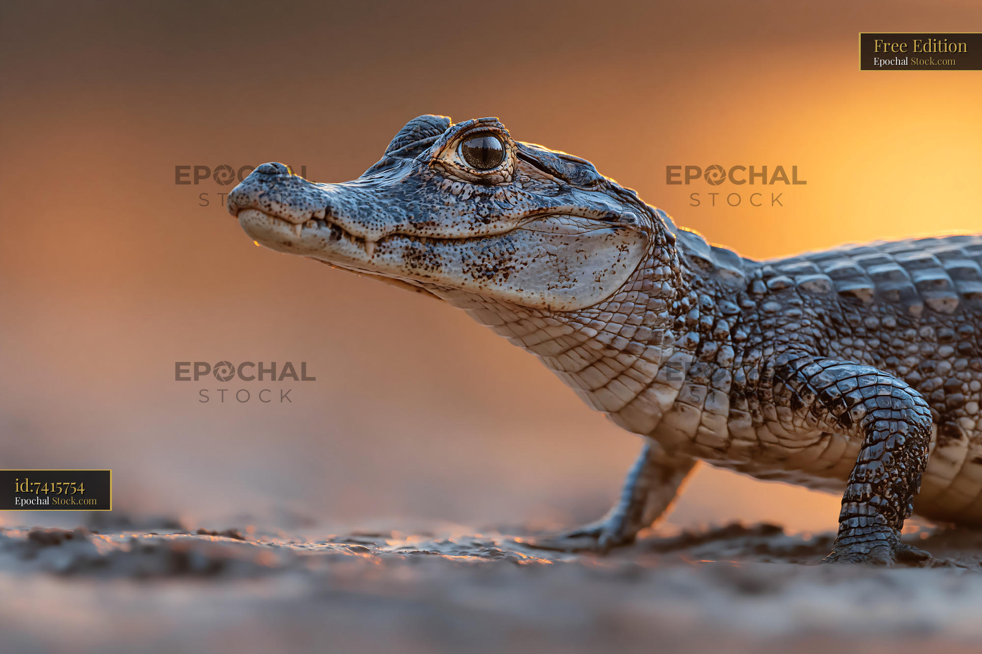 Juvenile caiman basking in the warm light of golden hour