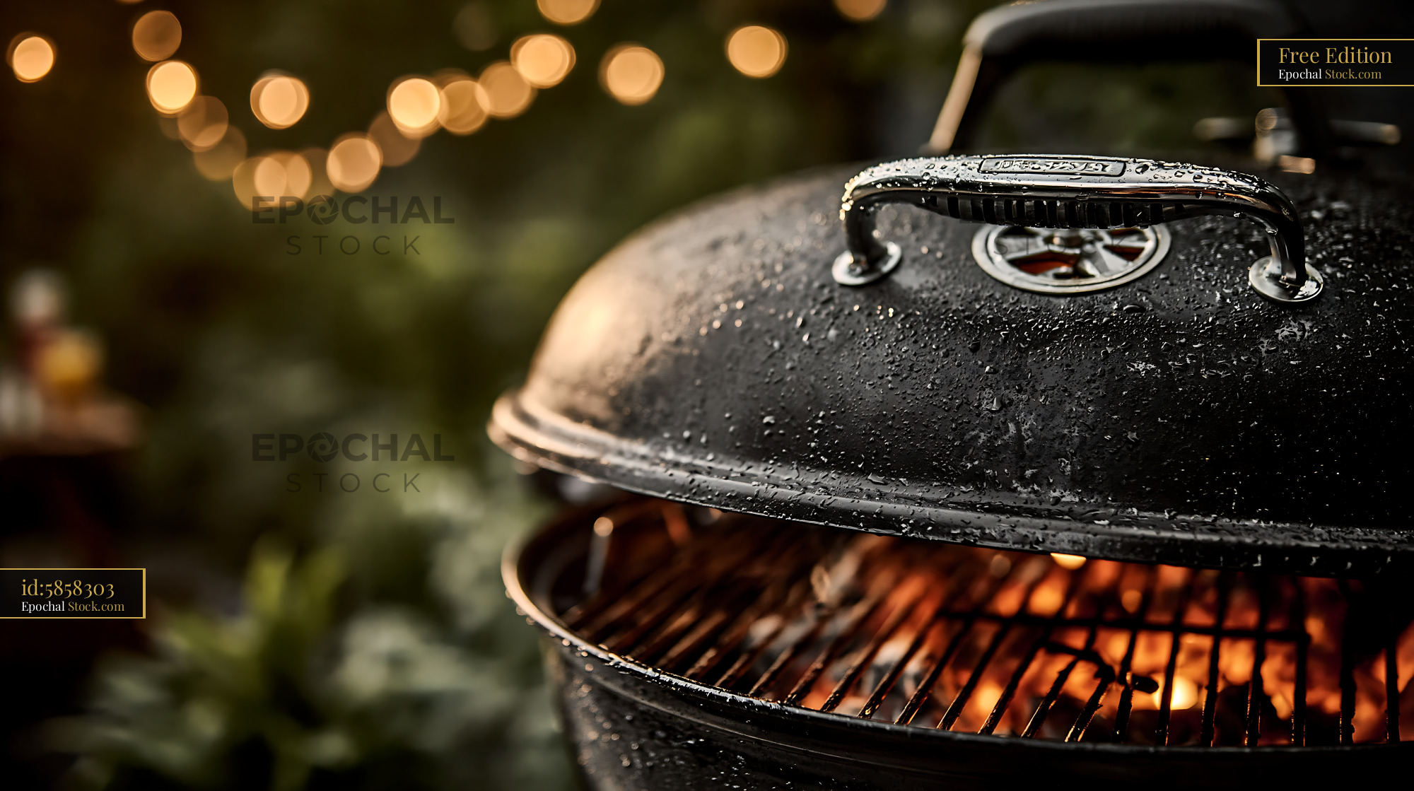 A black kettle grill with water droplets on the lid stands ready with glowing charcoal, surrounded by festive bokeh lights in a lush garden during a cozy evening party.