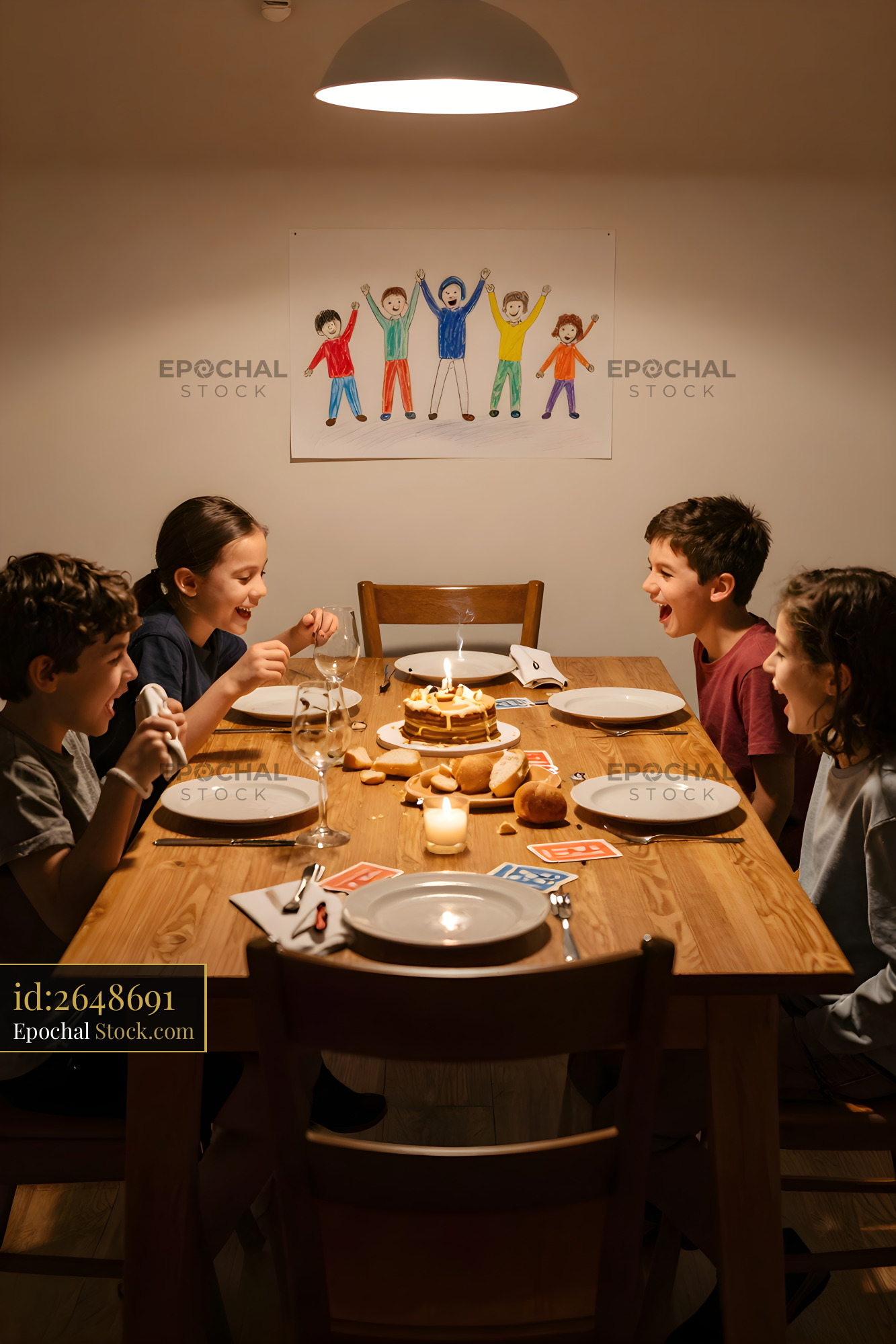 Five kids gather around a wooden table to celebrate a birthday. They are smiling and enjoying cake with candles. Plates and drinks are set in front of them. A drawing is on the wall.