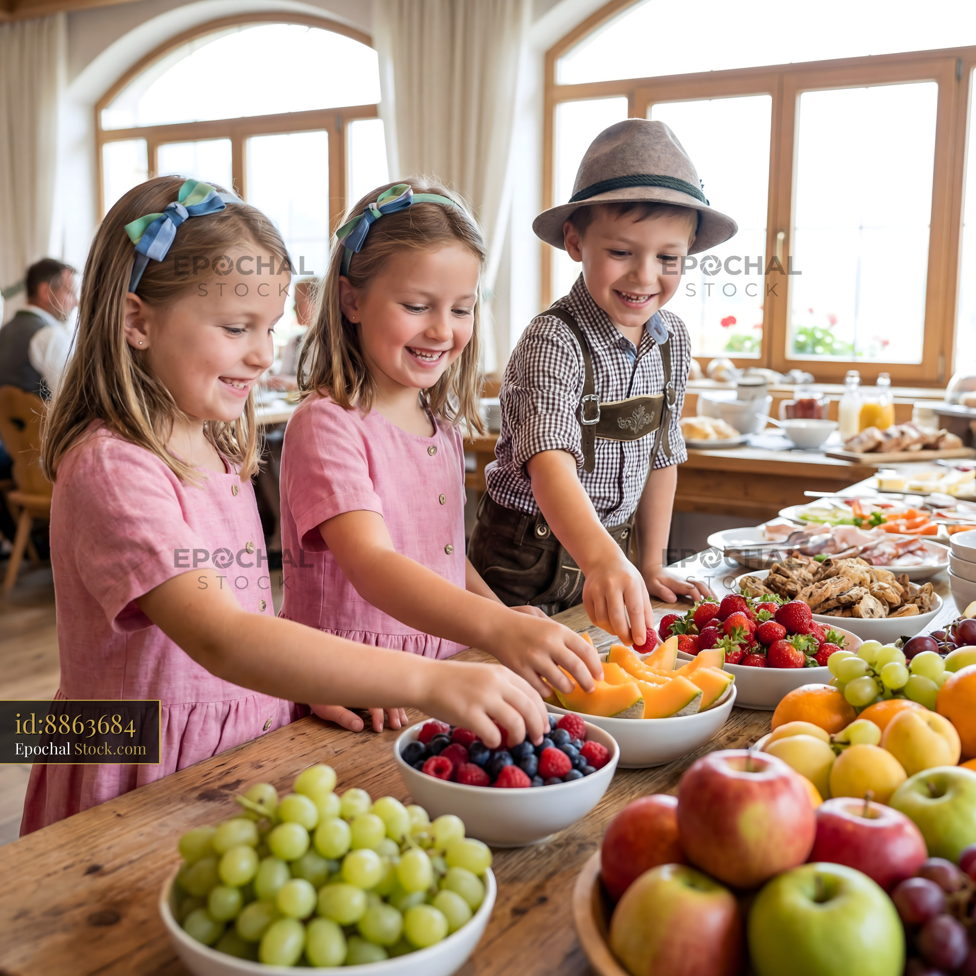 Kids enjoy picking fruits at a breakfast table in a cozy setting
