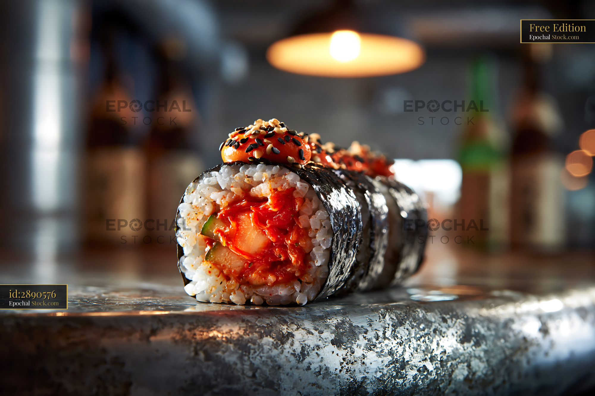 A vibrant kimchi fusion maki sushi roll sits on a textured metal bar, capturing the bold flavors of Korean-Japanese fusion in a modern, atmospheric restaurant setting.