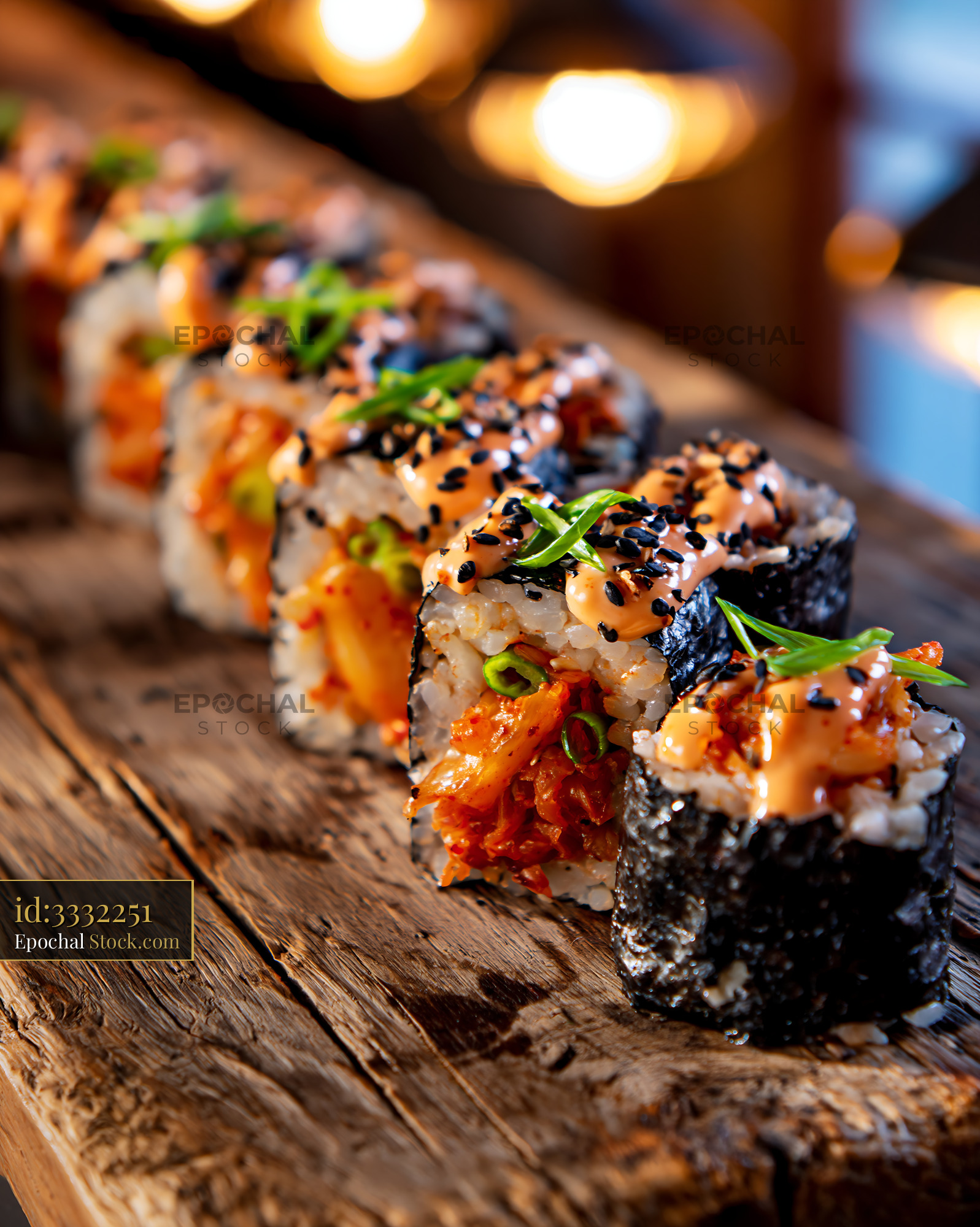 Gourmet kimchi fusion maki sushi rolls topped with spicy sauce and sesame seeds on a weathered wooden surface, blending Korean and Japanese culinary traditions with bold flavors.