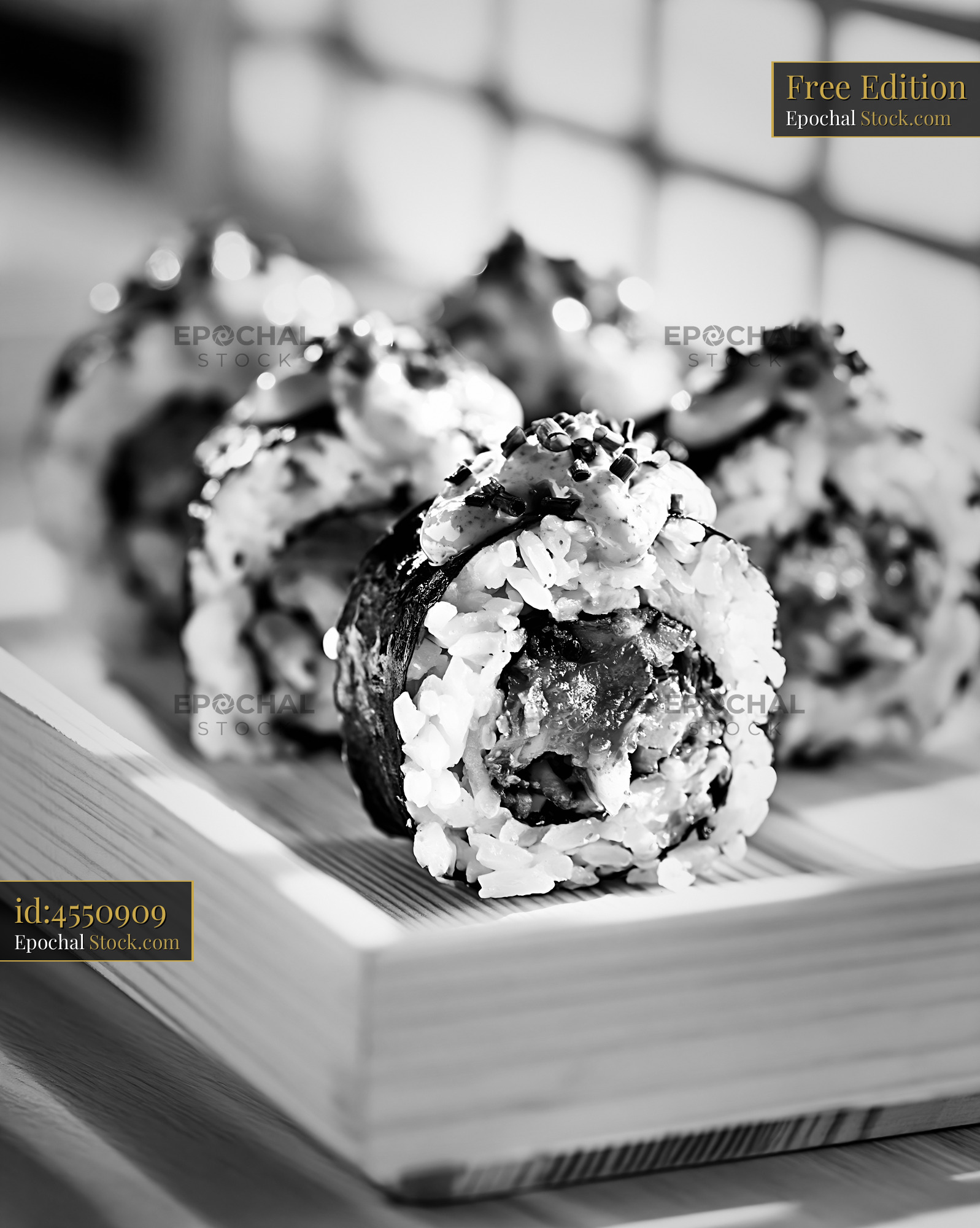 A sophisticated black and white close-up of kimchi fusion maki sushi, using dramatic window light to evoke a sense of modern culinary art and traditional Japanese atmosphere.