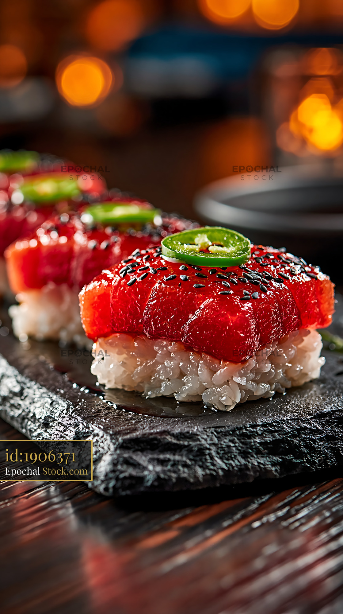 Gourmet vegan king oyster mushroom sushi topped with jalapeno and black sesame, served on a dark slate board in a warm restaurant setting, highlighting modern plant-based culinary art.