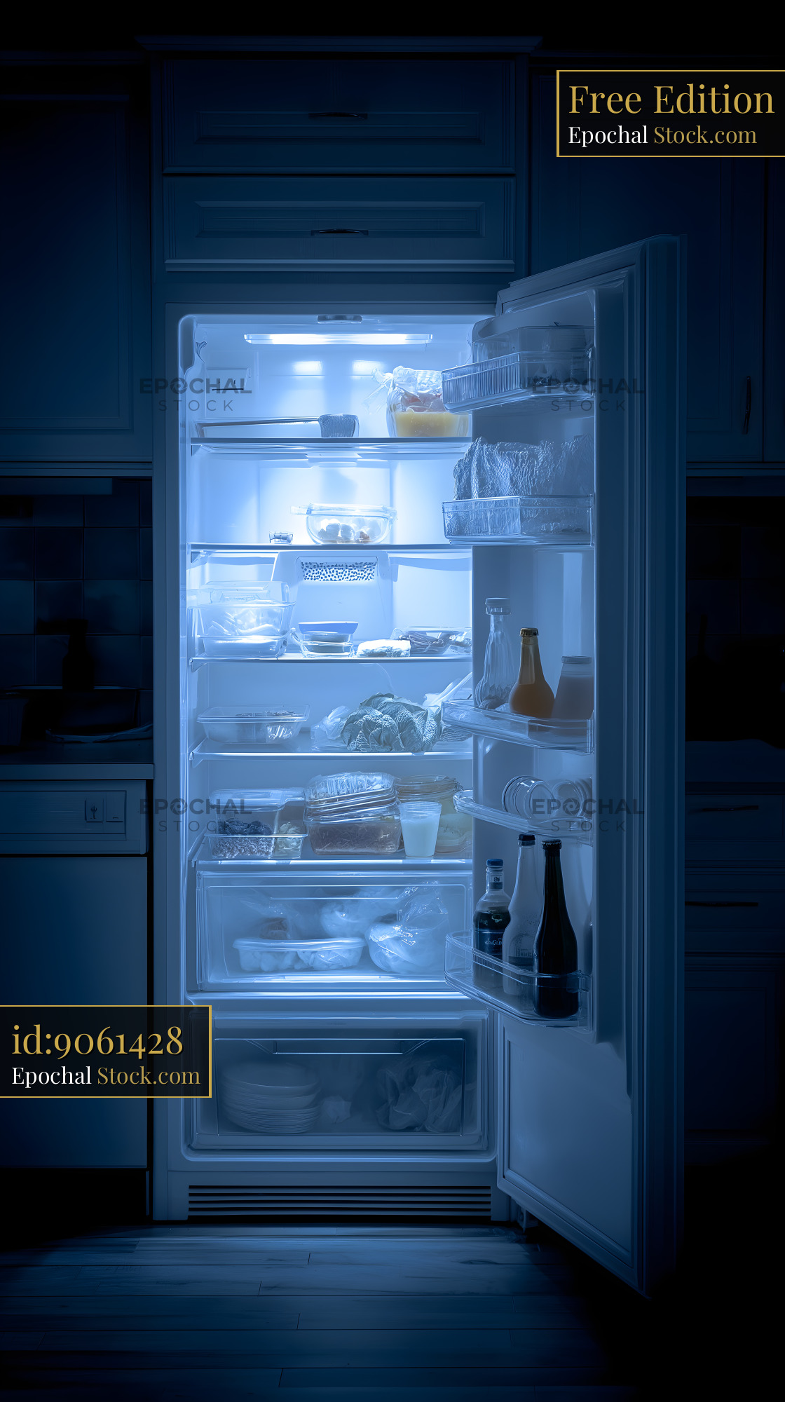 Kitchen refrigerator lit with food and drinks at night Free Premium Stock Image