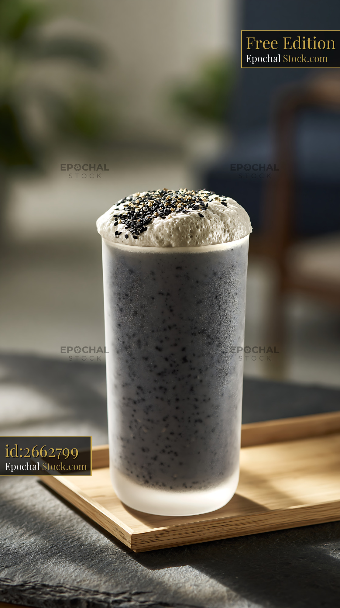 Kurogoma smoothie with thick foam and sesame seeds on a wooden tray