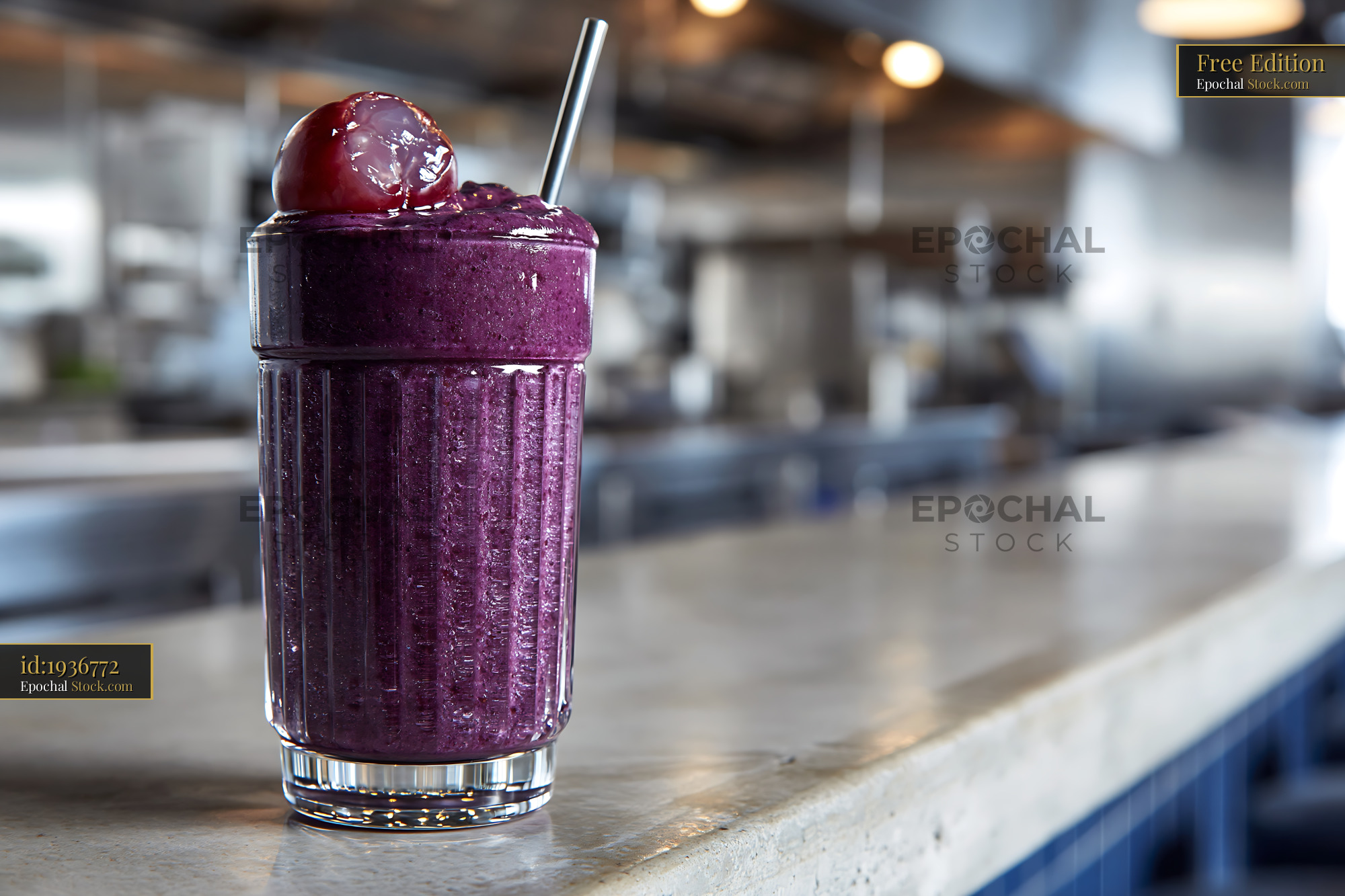 Kyoho grape smoothie with a metal straw on a modern bar counter