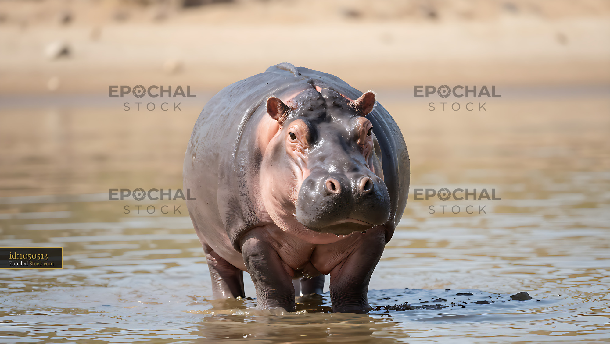 Large hippopotamus standing in shallow river water during daylight