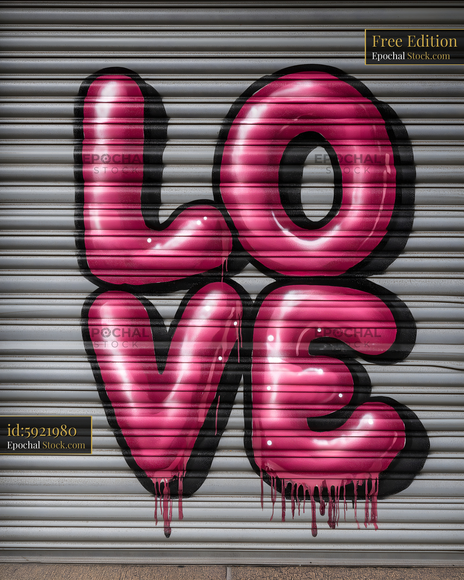 Large pink love graffiti on a roller shutter in an urban area Free Premium Stock Image