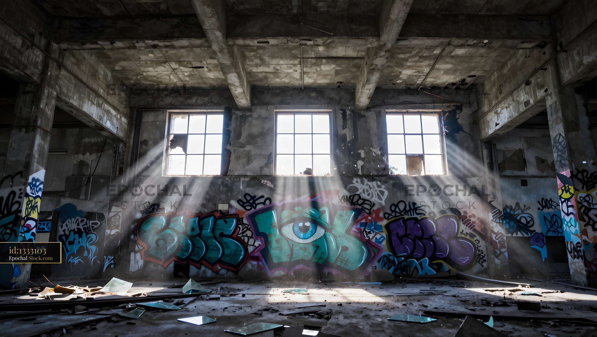 Sunlight streams through the broken windows of an empty building. Colorful graffiti covers the walls. Broken glass and debris are scattered on the ground.