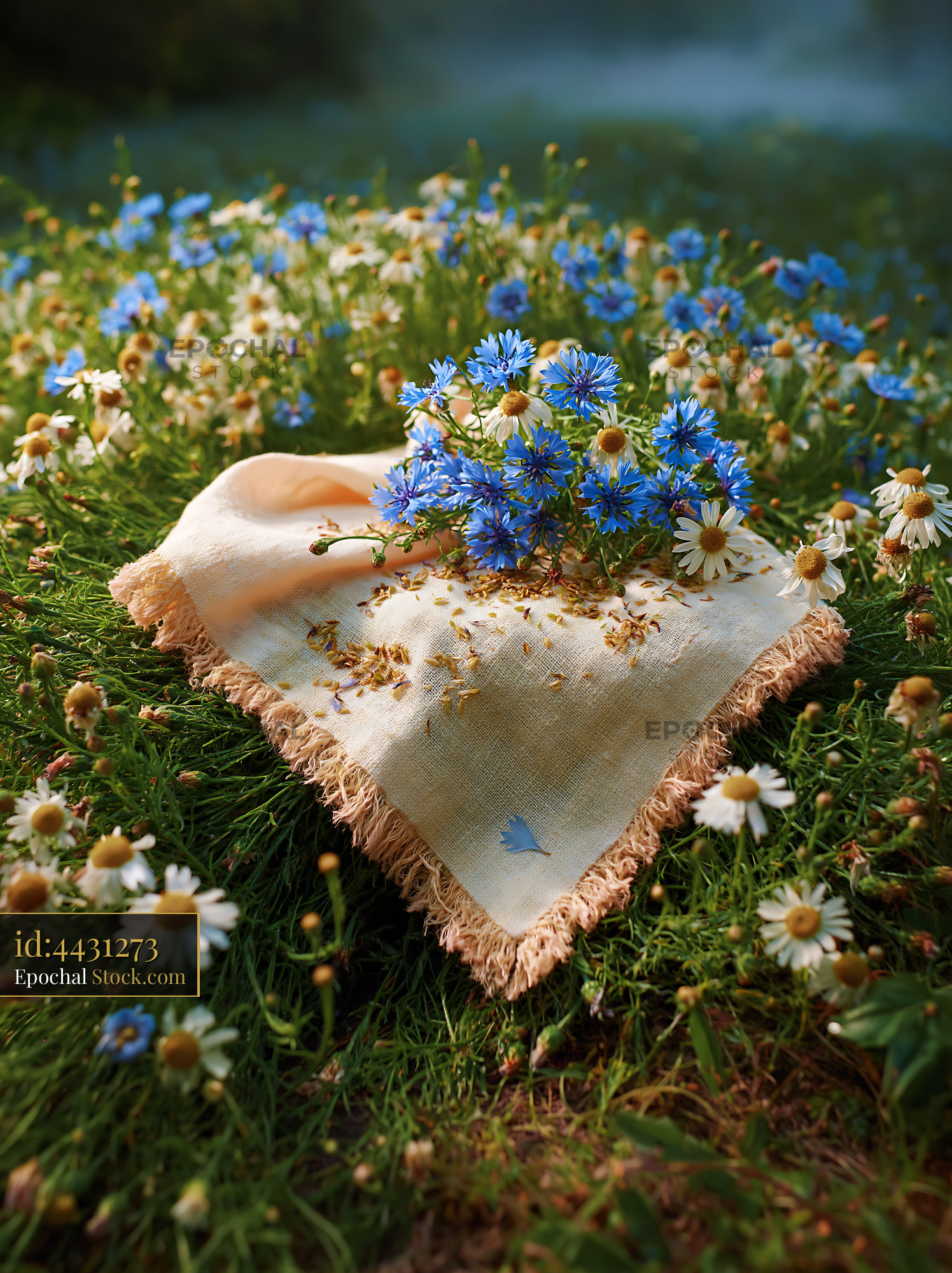 A fringed linen napkin rests on lush green grass surrounded by blooming wildflowers, capturing the peaceful essence of a summer morning in the countryside.