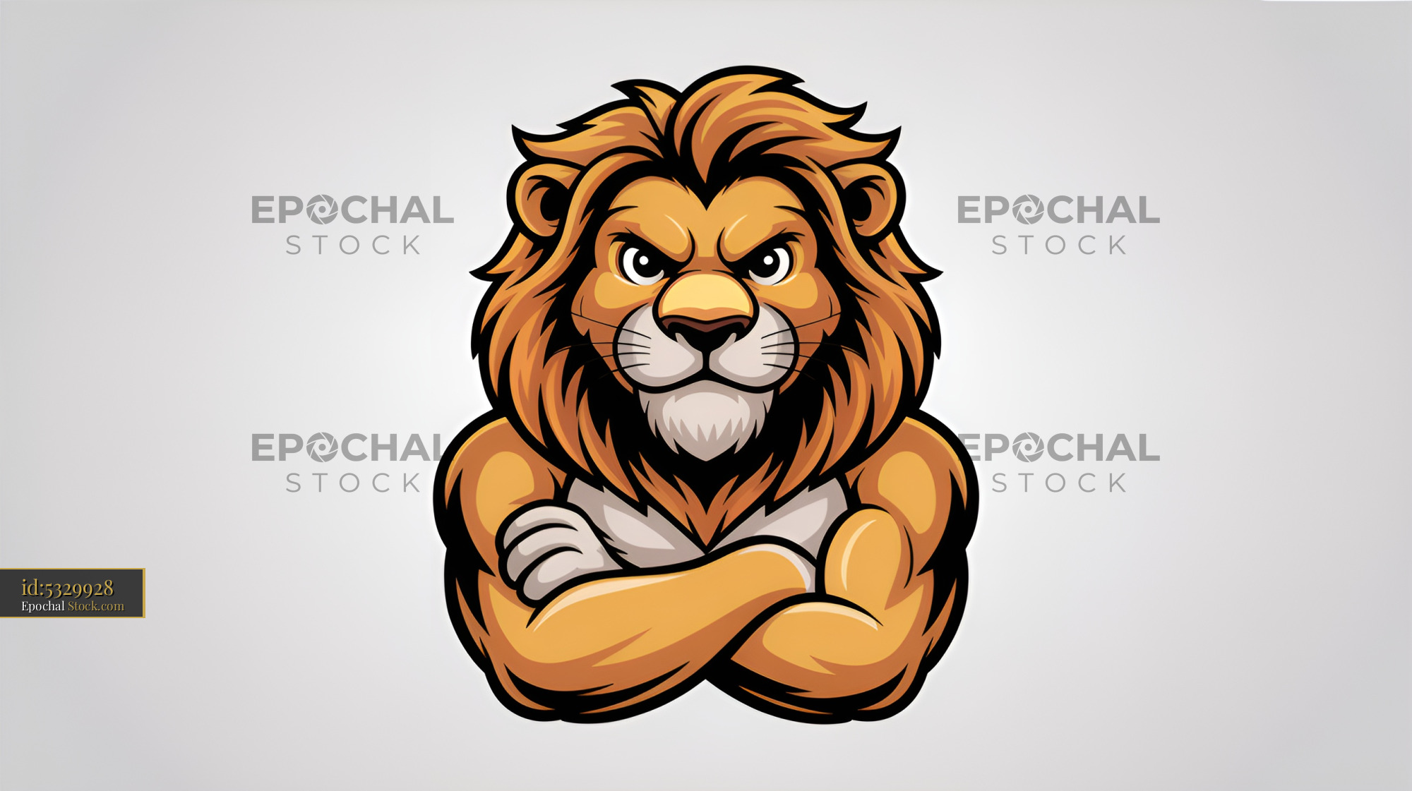 A lion character stands with arms crossed, showing a strong posture. The lion has a fierce expression and prominent mane. The background is simple and light colored.