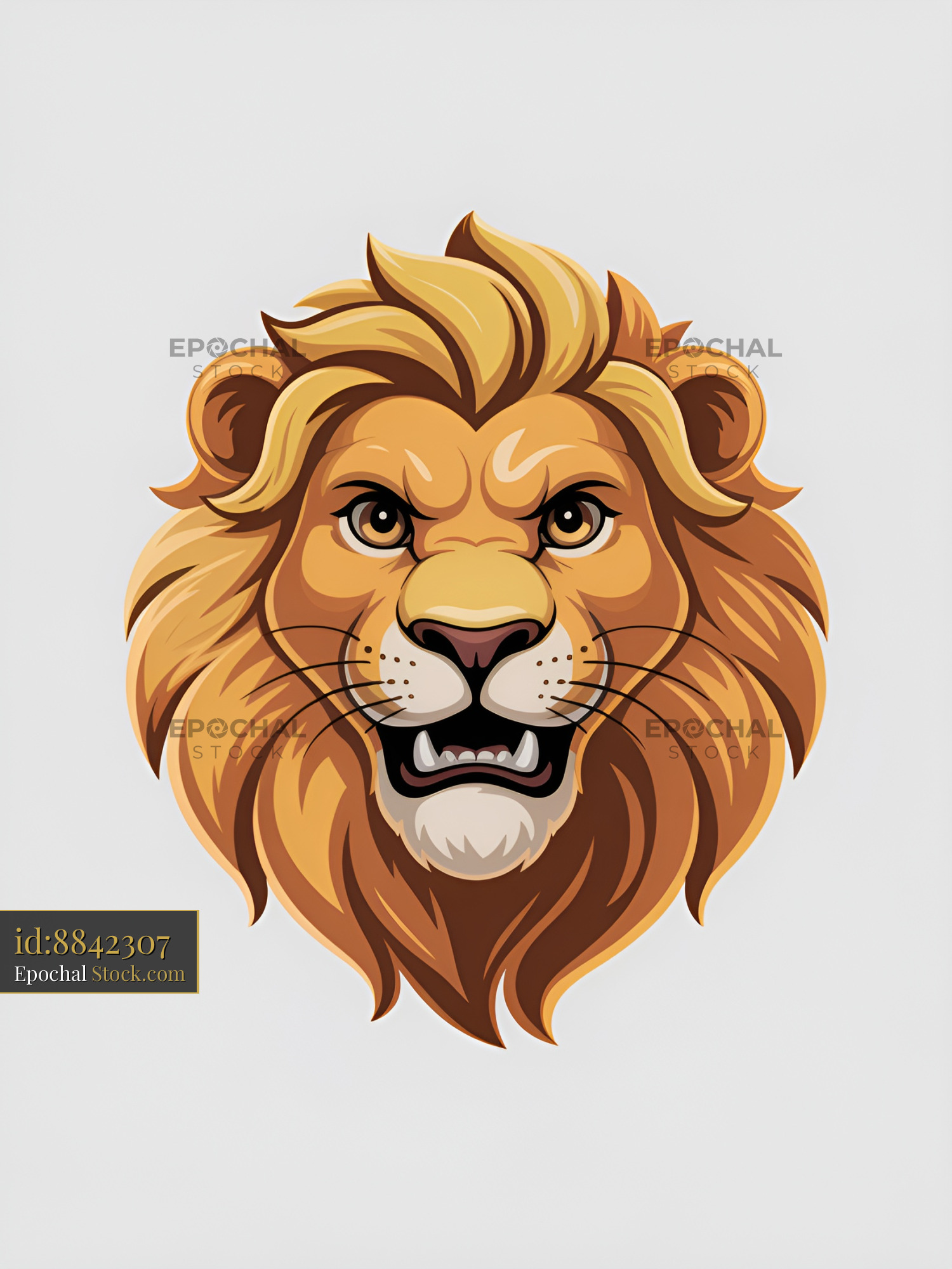 A lion's head is shown with a strong expression. The mane is thick and wavy, and the colors are warm. The design is simple and focuses on the features of the lion.