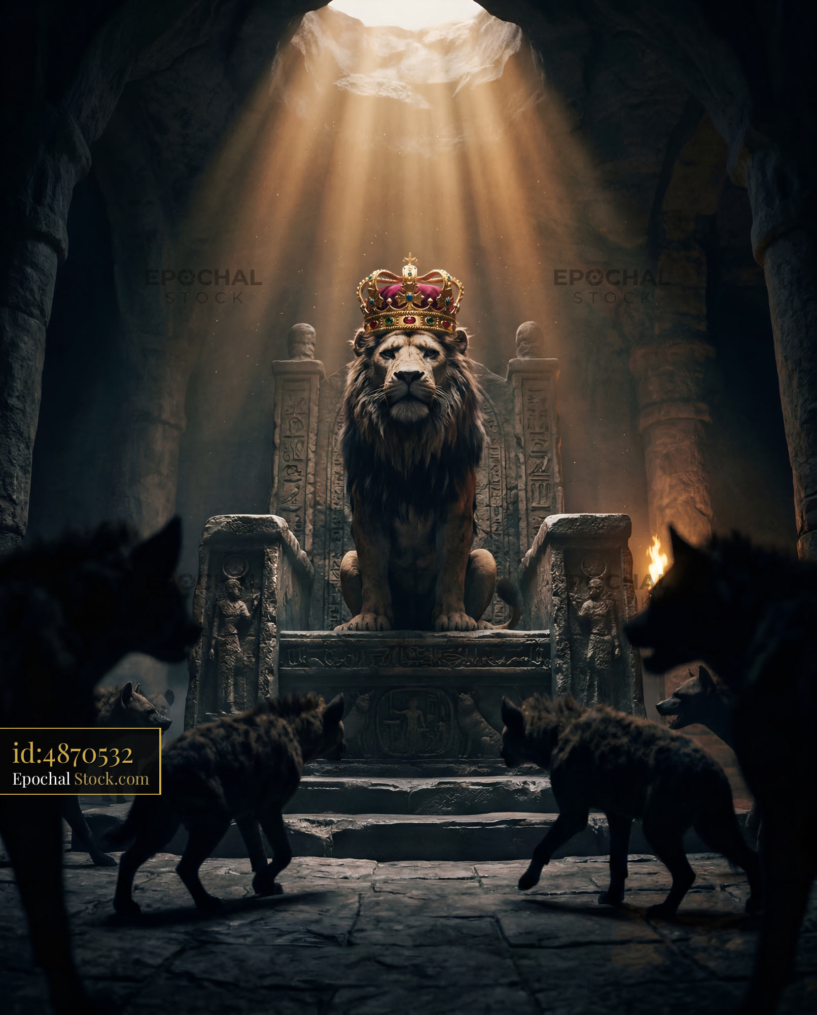 Lion on throne with crown surrounded by wolves in cave Premium Stock Photo