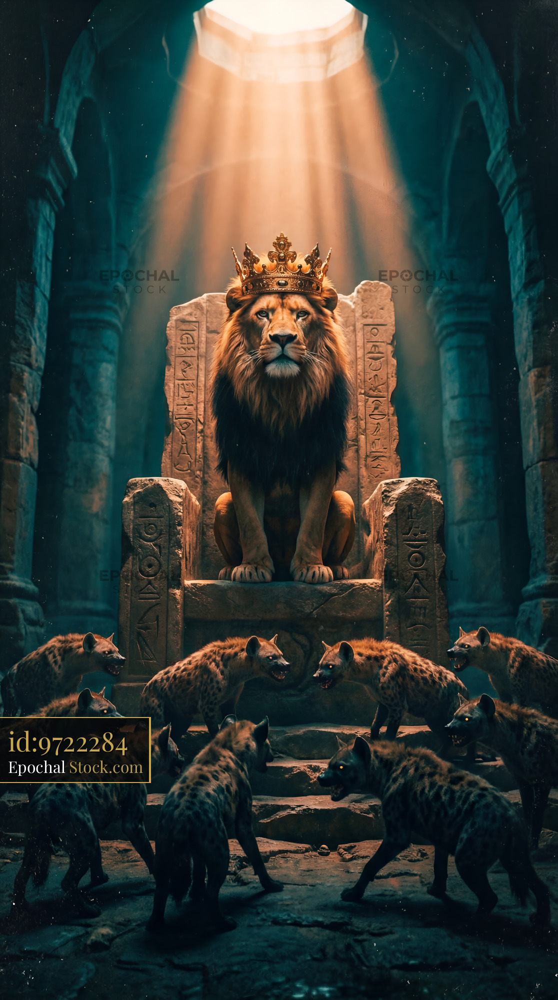 A lion with a crown sits on a stone throne in an old temple. Hyenas gather around the throne. Light shines down from above, creating a dramatic scene.